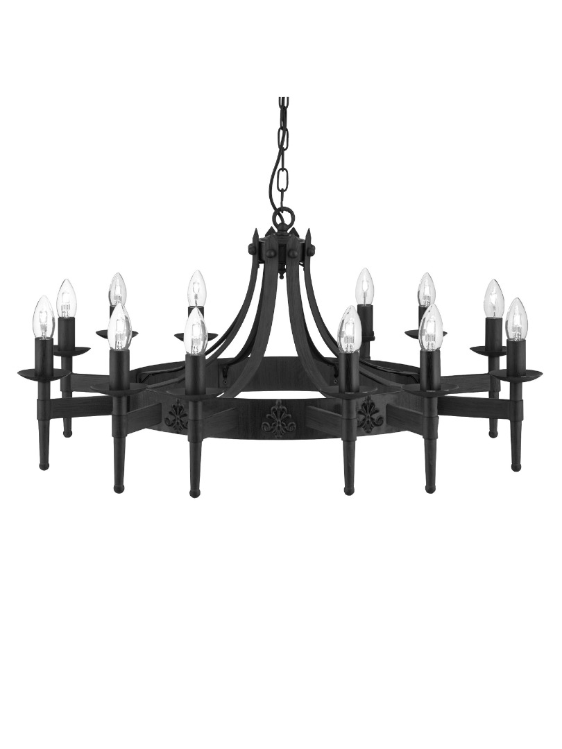 Een stijlvolle klassieke hanglamp uit de Cartwheel collectie van het merk Searchlight. De lamp met smeedijzere look heeft een mat zwarte kleur. Het ontwerp doet denken aan de sfeer van kastelen uit de middeleeuwen en brengt een vleugje historische charme in huis. De lamp wordt geleverd exclusief lichtbronnen en is geschikt voor 12x max. 60 watt en E14 fitting. Mooi toepasbaar in deze lamp zijn kaarsvormige lichtbronnen. De lamp kan goed geplaatst worden in verschillende ruimtes zoals de hal, slaap- of woonkamer. Bij installatie is de lamp in hoogte te verstellen.