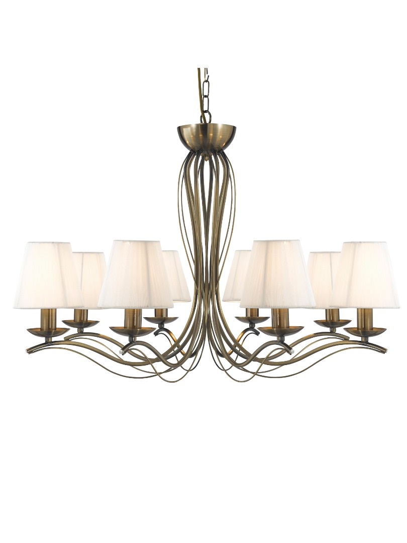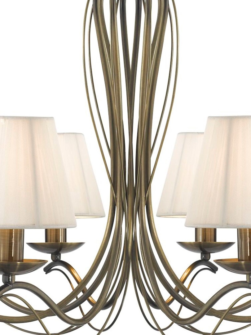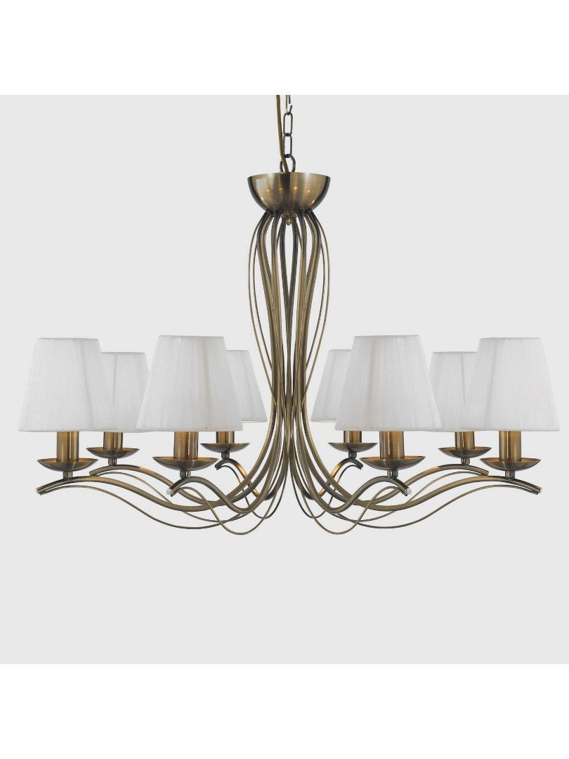 De 8-lichts Andretti hanglamp van het merk Searchlight. Deze hanglamp in antiek messing geeft elke slaap-, woon-, eetkamer of gang een tijdloze uitstraling. De klassieke messing afwerking vormt een elegant middelpunt aan het plafond, terwijl de acht lampen met bijpassende ivoorkleurige stoffen kappen sfeervol schaduwen door de ruimte verspreiden. De lamp wordt geleverd exclusief lichtbronnen en is geschikt voor E14 fitting en max. 8x 60 watt. Bij installatie in hoogte te verstellen.