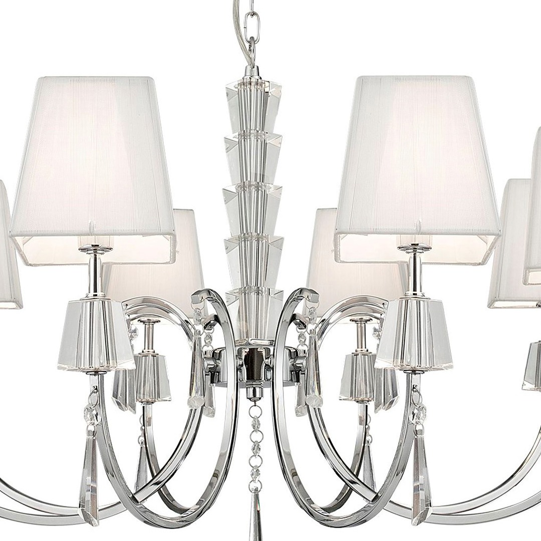 De 8-lichts Portico hanglamp van het merk Searchlight. Deze hanglamp in chromen kleur geeft elke slaap-, woon-, eetkamer of gang een tijdloze uitstraling. De klassieke afwerking vormt een elegant middelpunt, terwijl de 8 lampen met witte stoffen kappen het minimalistisch houden. De lamp wordt geleverd exclusief lichtbronnen en is geschikt voor kleine G9 fitting en max. 8x 33 watt.