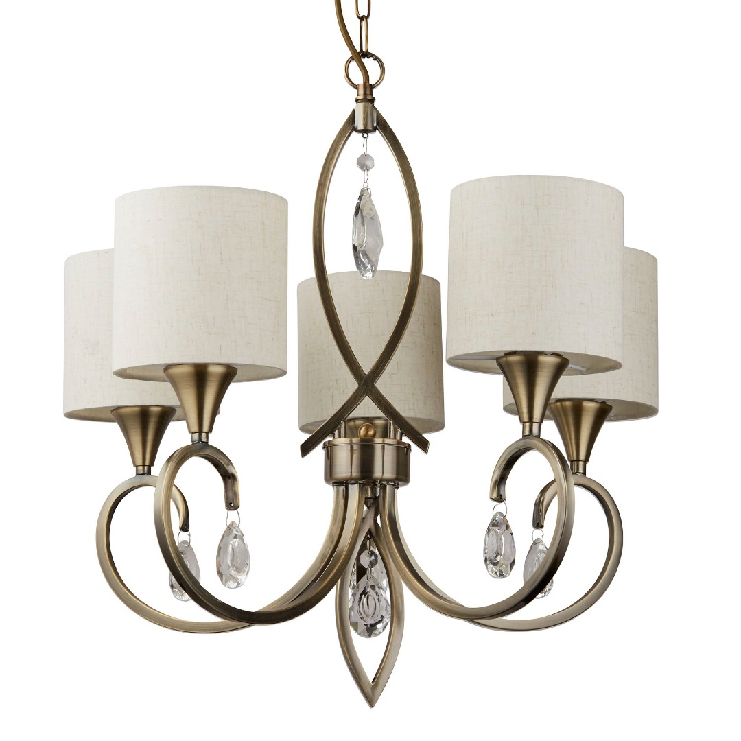 De 5-lichts Alberto hanglamp van het merk Searchlight. Geef je woon-, slaap- of eetkamer een stijlvolle en luxueuze uitstraling met deze prachtige hanglamp. De lichtpunten zijn geplaatst in ivoorkleurige linnen kappen, waaronder zich een schitterend gebogen ontwerp van antiek messing bevindt met sierlijke hangende kristaldetails. Bij installatie in hoogte te verstellen. De lamp wordt geleverd exclusief lichtbronnen en is geschikt voor E14 fitting en max. 5x 60 watt.
