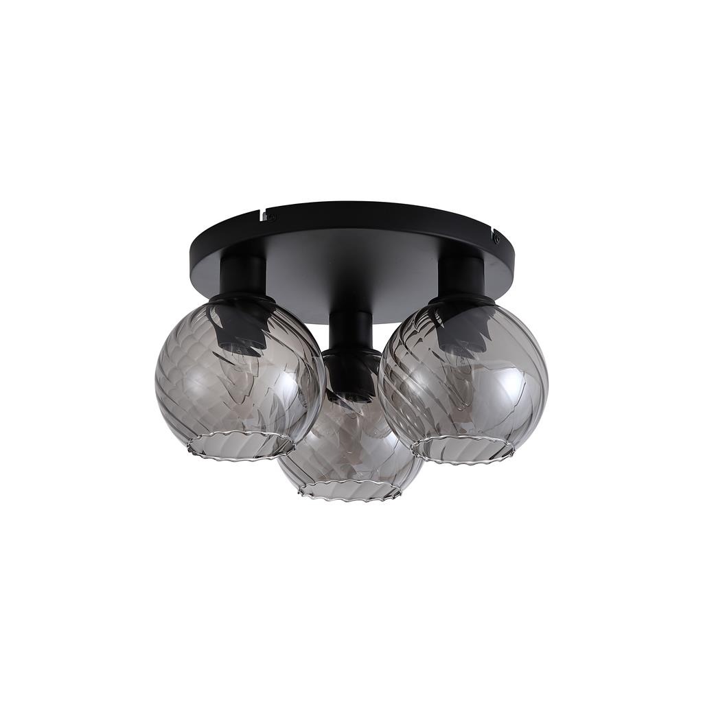 Een lamp uit de Radiance collectie van het merk Searchlight. De plafondlamp is voorzien van drie rookglazen bolkappen met een subtiel gedraaid patroon dat zorgt voor extra textuur en diepte. De lamp heeft een zwartkleurige plafondplaat. De zwarte kleur in combinatie met de goudkleurige details geeft de lamp een moderne en luxe uitstraling. De lamp is exclusief lichtbronnen en is geschikt voor maximaal 3x 60W en E27 fitting.