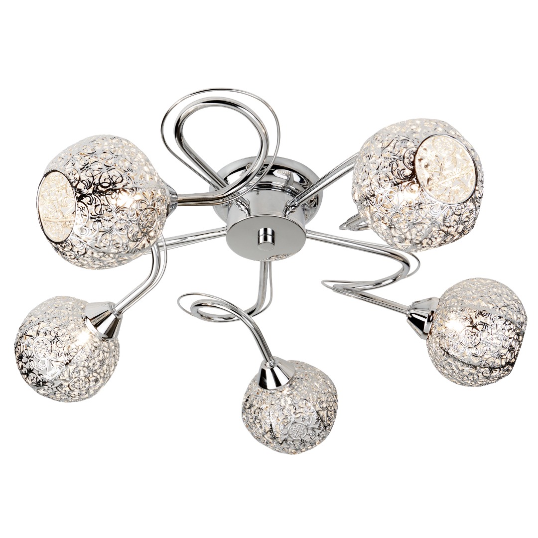 Een plafondlamp uit de Souk collectie van het merk Searchlight. De Souk plafondlamp beschikt over vijf lichtpunten en is uitgerust met chroomkleurige kappen met een verfijnd opengewerkt patroon bevestigd aan gebogen armen. Zodra de lamp wordt ingeschakeld verspreiden de kappen een prachtig lichtspel op de omliggende muren. In een klassiek interieur zorgt dit armatuur voor een tijdloze uitstraling en een extra vleugje elegantie. De lamp wordt geleverd exclusief lichtbronnen en is geschikt voor kleine G9 fitting en max. 5x 33 watt.