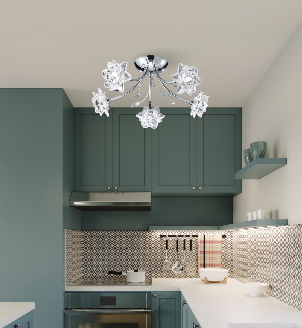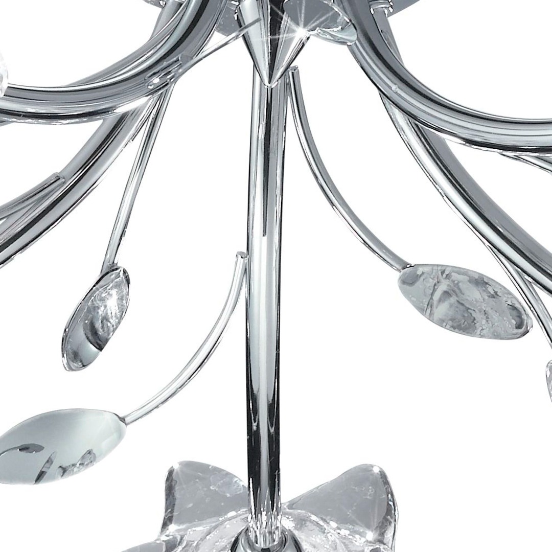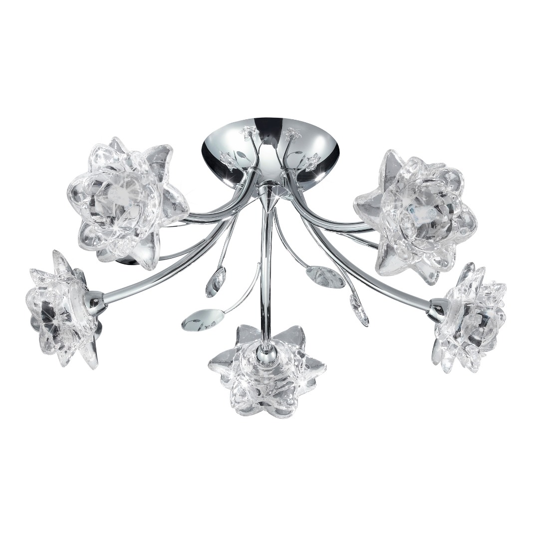 Een plafondlamp uit de Bellis collectie van het merk Searchlight. De Bellis plafondlamp heeft een chromen kleur met vijf lichtpunten en is voorzien van heldere bloemvormige glazen en sierlijke bladdecoraties. Een prachtige aanvulling op elk interieur, zoals de slaap-, woon-, eetkamer of keuken. De vijf gedetailleerde bloemen zorgen voor een sfeervolle en stijlvolle verlichting van de ruimte. De lamp wordt geleverd exclusief lichtbronnen en is geschikt voor kleine G9 fitting en max. 5x 33 watt.