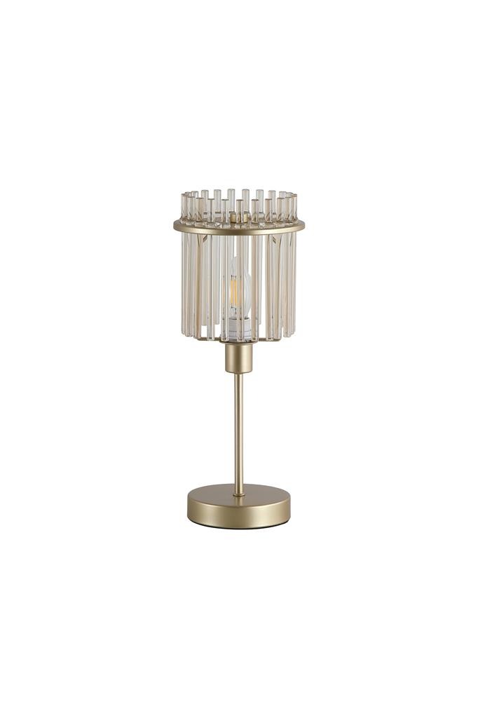 Een tafellamp uit de Swizzle collectie van het merk Searchlight. Deze lamp heeft een opvallende kap van champagnekleurige glazen staven gecombineerd met een strakke gouden kleur. De lamp is perfect als decoratief accent op een dressoir, bijzettafel of bureau. Je kunt hem ook goed in tweeën gebruiken, bijvoorbeeld naast het bed in de slaapkamer of logeerkamer. De lamp komt exclusief lichtbron en is geschikt voor E14 fitting en maximaal 60 watt.