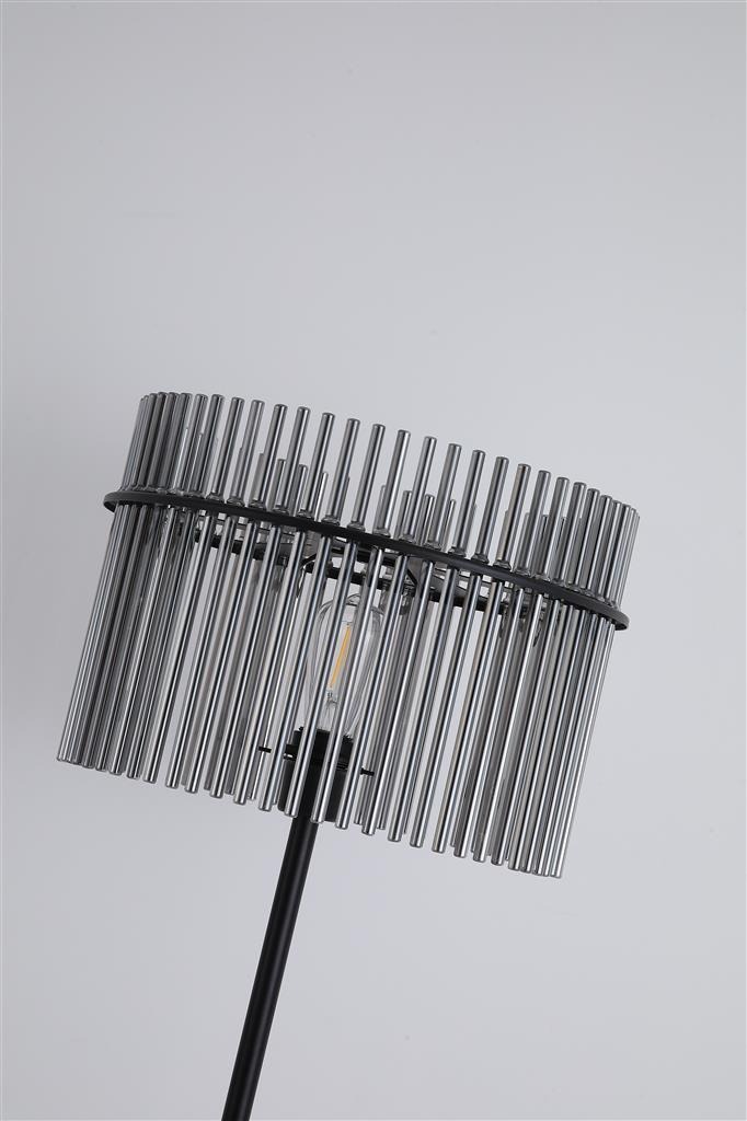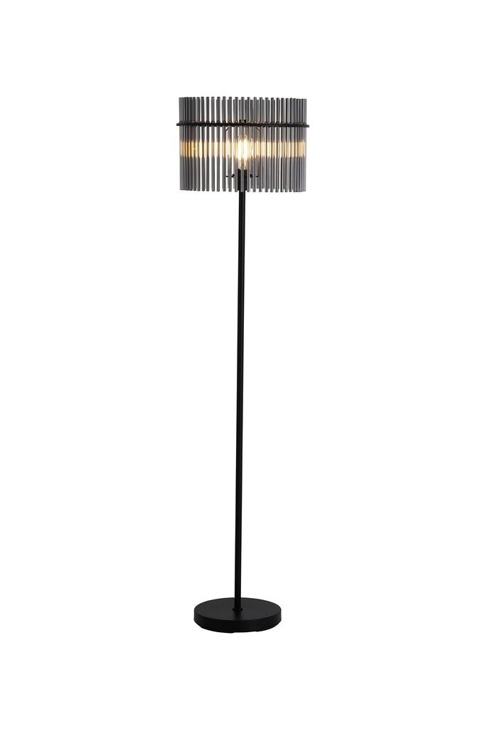 Een vloerlamp uit de Swizzle collectie van het merk Searchlight. Deze lamp heeft een opvallende kap van verticale rookglas staven gecombineerd met een strakke zwarte kleur. De glazen staven geven de lamp een luxe en moderne uitstraling ook wanneer het licht uit staat. De lamp valt op, maar blijft rustig genoeg om mooi in de ruimte te passen. Perfect voor een hoek in de woonkamer, naast de bank of in de slaapkamer. De kap van gerookt glas verspreidt het licht op een sfeervolle manier en zorgt tegelijk voor een decoratief en elegant accent in moderne en open ruimtes. De lamp komt exclusief lichtbron en is geschikt voor E27 fitting en maximaal 60 watt.