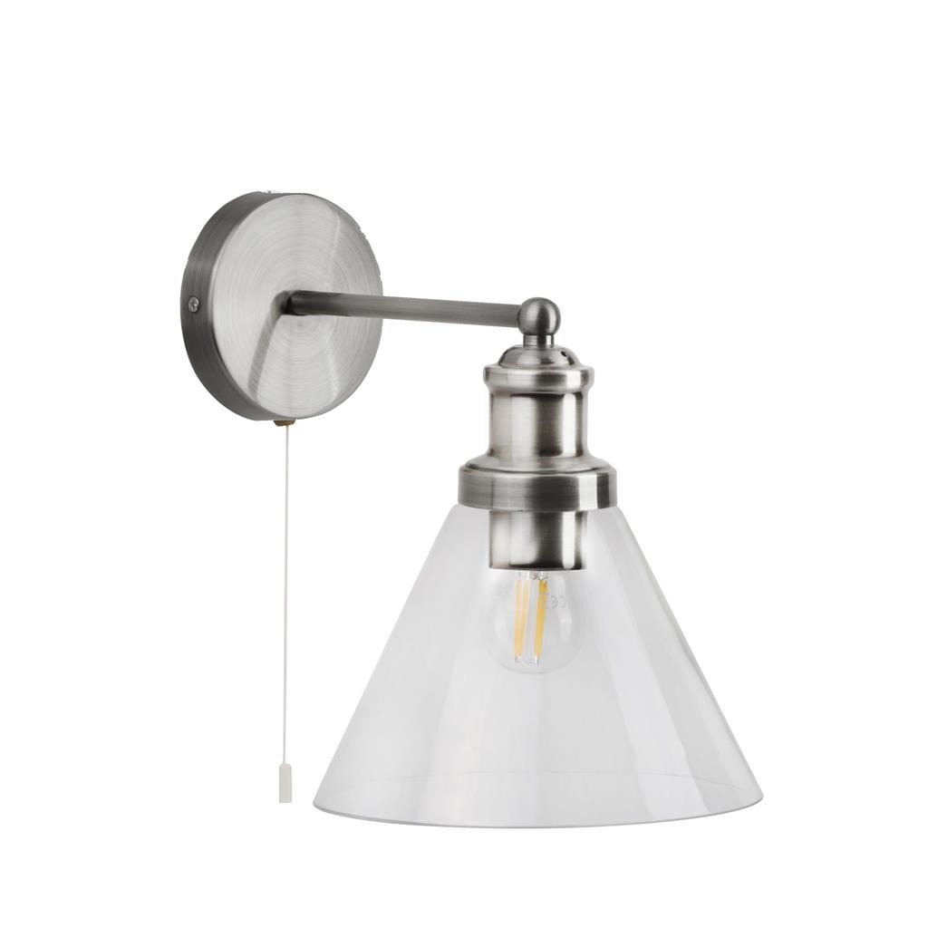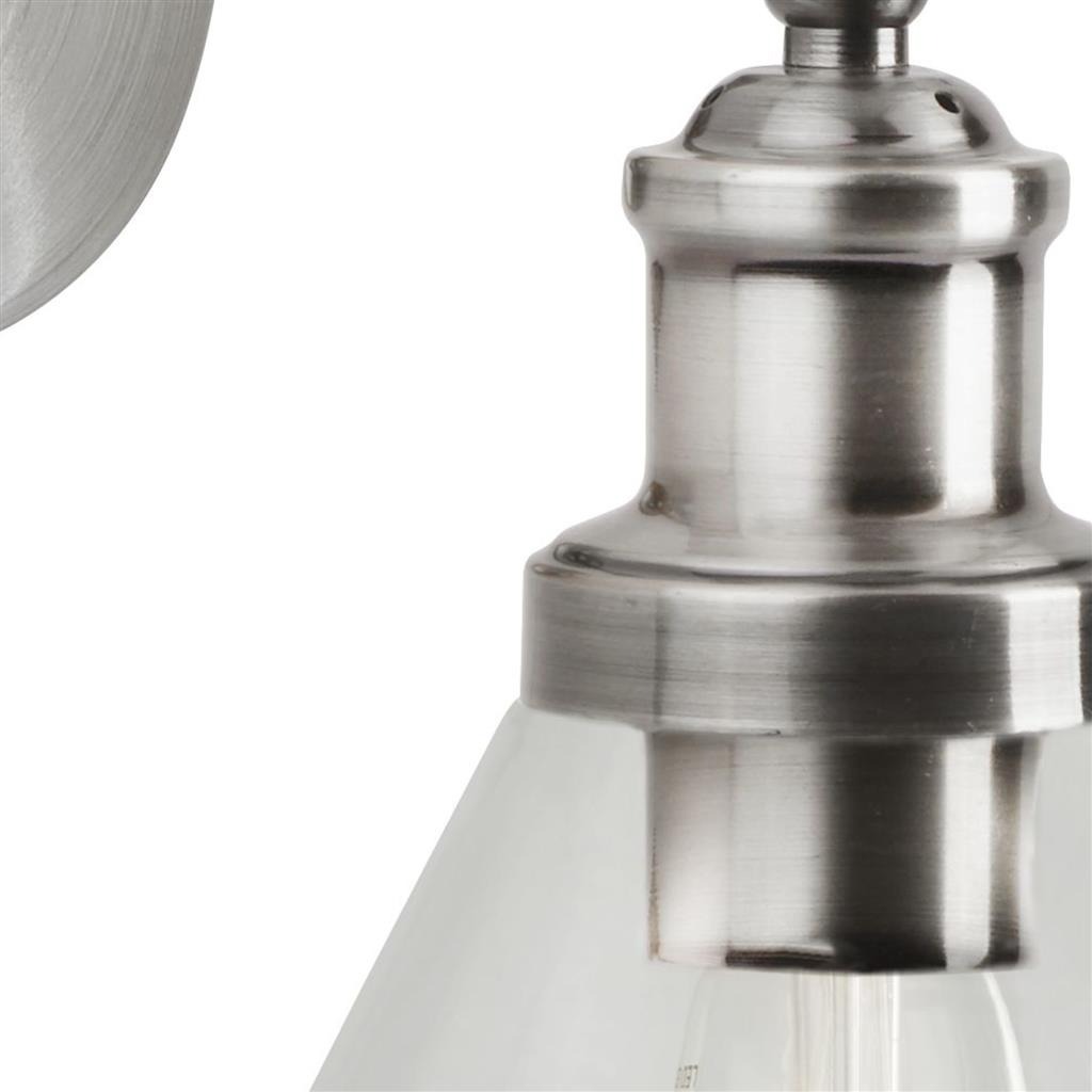Een klassieke wandlamp uit de Pyramid collectie van het merk Searchlight. De lamp heeft een zilveren kleur en een helder glazen kapje. De lamp wordt geleverd exclusief lichtbron met E27 fitting geschikt voor max. 60 watt. De lamp kan mooi geplaatst worden in de hal, woonkamer of naast het bed in de slaapkamer.