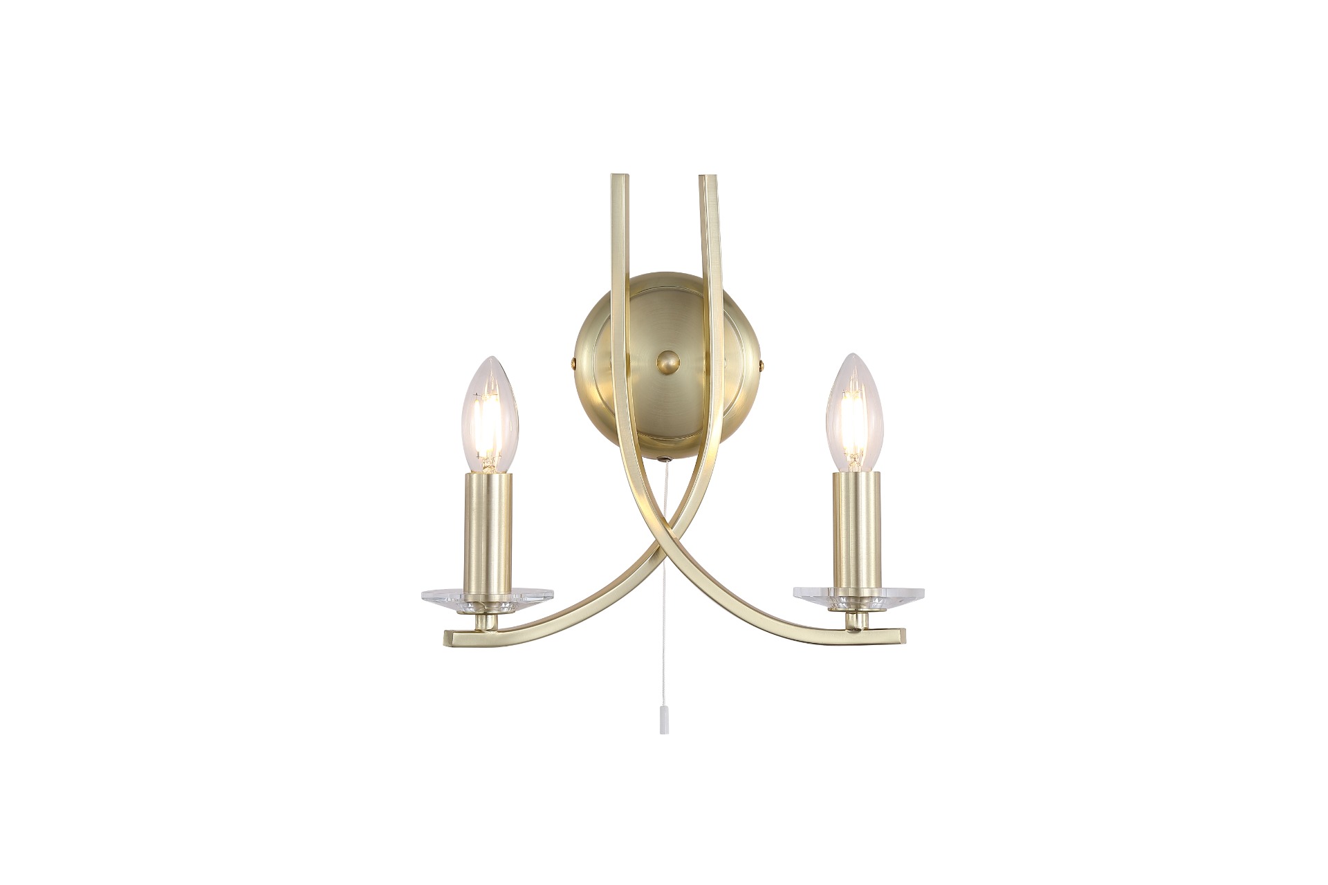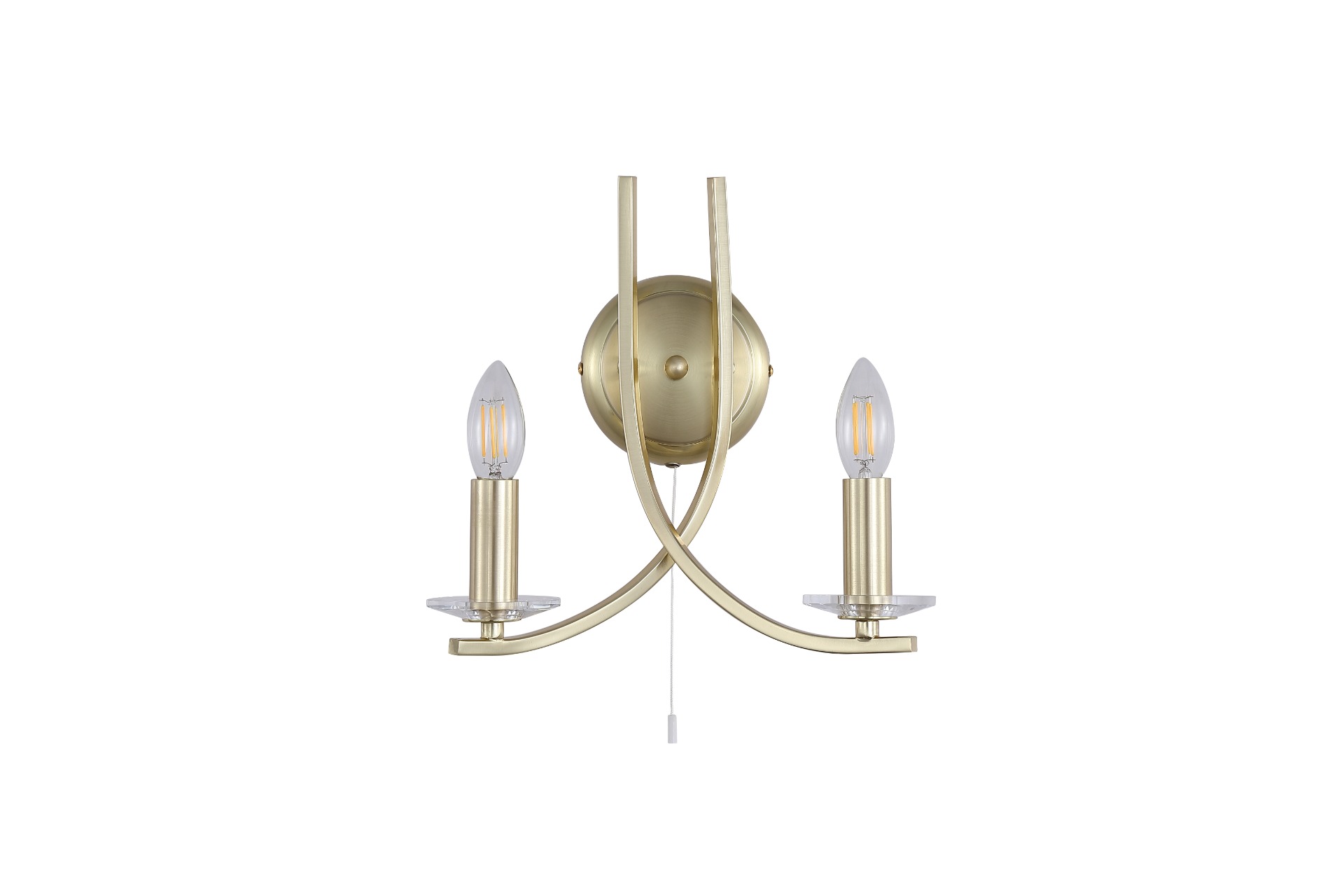Een wandlamp uit de Ascona collectie van het merk Searchlight. Deze lamp in satijn messing kleur combineert een klassieke stijl met een moderne uitstraling. Met de 2 lamphouders waar (optioneel) kaarslampen mooi tot hun recht komen, trekt deze lamp gegarandeerd de aandacht in elke ruimte waar hij wordt toegepast. Een stijlvolle en opvallende lamp die perfect past in de hal, woon,- of slaapkamer. De lamp is exclusief en geschikt voor 2 lichtbronnen van maximaal 60 watt en E14 fitting.