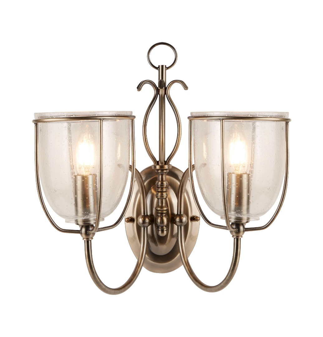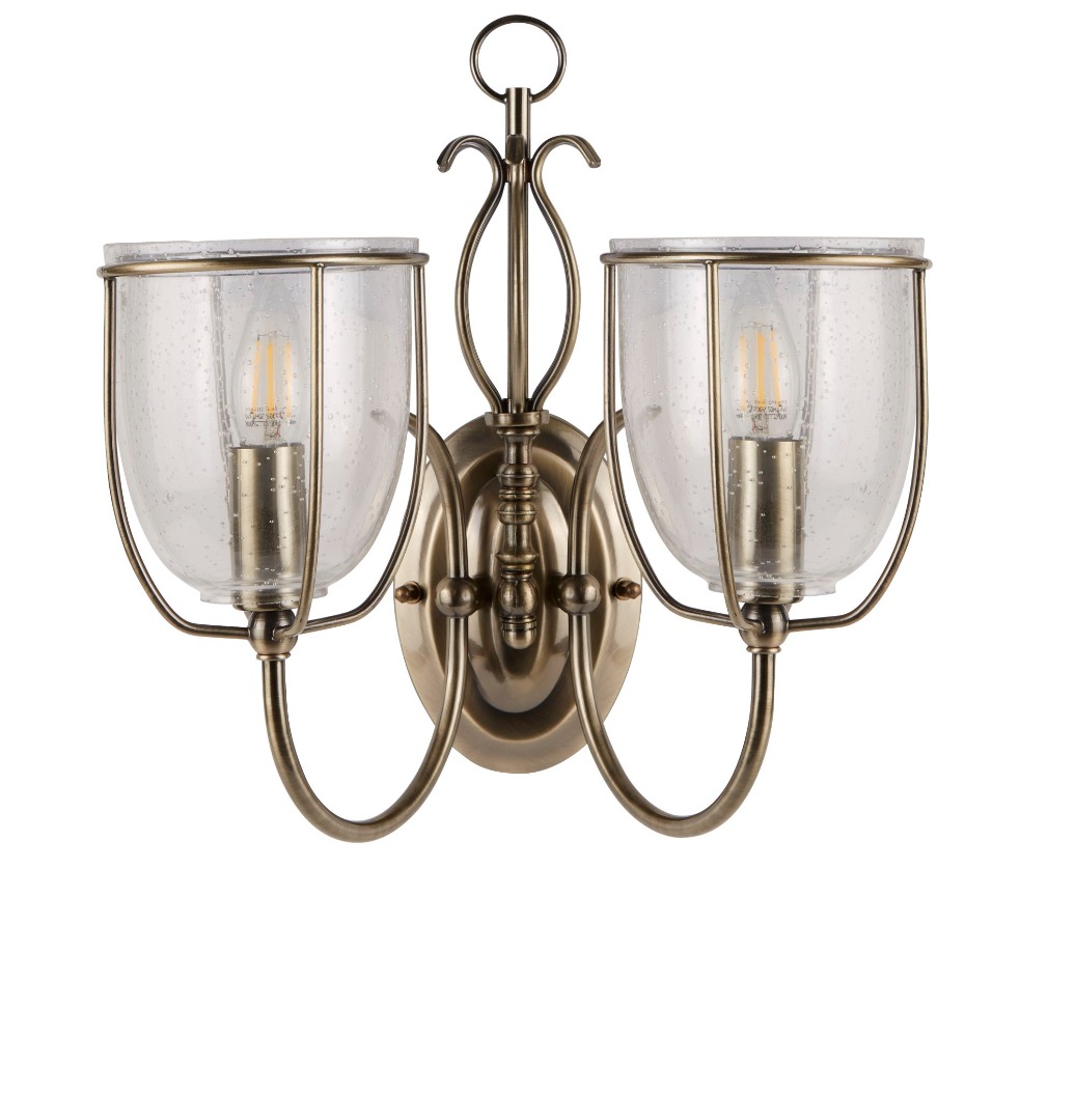 De Silhouette wandlamp van het merk Searchlight. Deze wandlamp met twee lichtpunten in antiek messing heeft een elegante klassieke uitstraling met een sierlijk en nostalgisch karakter. De lamp is voorzien van gebogen armen en twee naar boven gerichte glazen. De glazen zorgen dat het licht mooi over de muur wordt verspreid. Daarnaast beschikt de lamp over een handige trekkoordschakelaar. De lamp wordt geleverd exclusief lichtbronnen en is geschikt voor E14 fitting en max. 2x 60 watt.