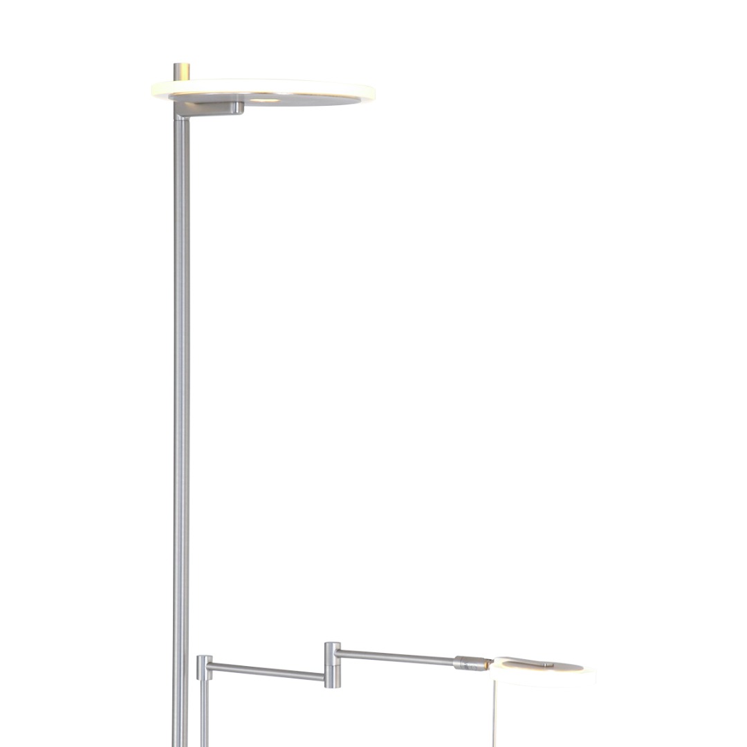 Deze moderne vloerlamp komt uit de Turound LED collectie en heeft een stalen kleur met helder glazen reflectors. De lamp heeft een leeslamp en een uplighter, beide met een LED module. De lamp is tevens voorzien van pulsdimmers, waarmee u zelf de ideale lichtsterkte in kunt stellen. De dimmers zitten op de opgaande stang waardoor ze eenvoudig bedienbaar zijn. Kort aanraken staat voor aan/uit, lang aanraken staat voor meer / minder licht. De uplight en zijarm zijn afzonderlijk van elkaar dimbaar. De hoogte van de uplighter is 187 centimeter, de leesarm is in hoogte verstelbaar van 100 centimeter tot 140 centimeter en de diameter van de voet is 27 centimeter.