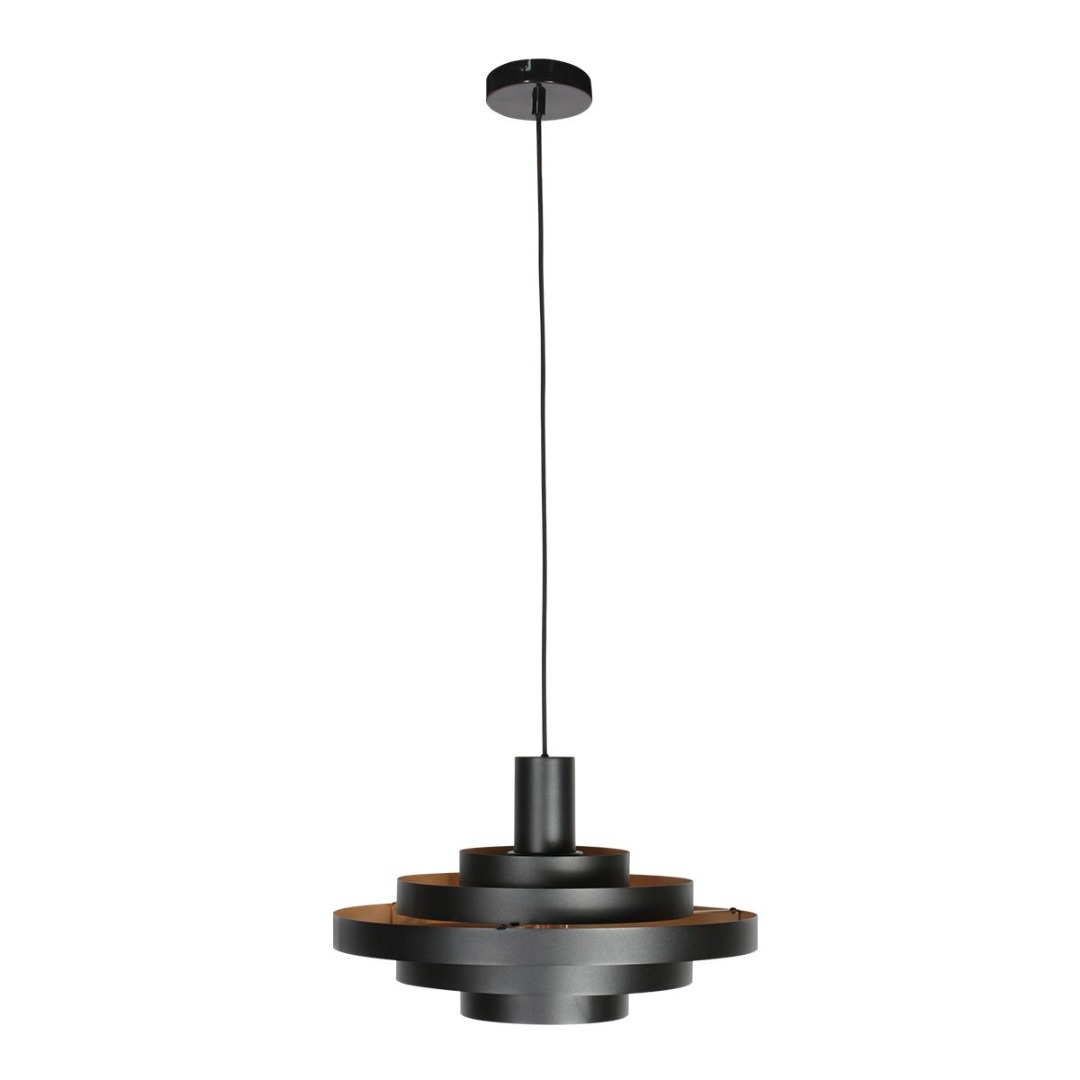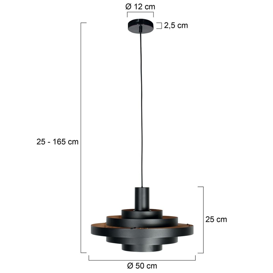 Een hanglamp uit de Halo Cirque serie van Steinhauer. De lamp is een stijlvolle zwarte hanglamp die opvalt door haar vijf metalen ringen met een speels verloop van smal naar breed en weer naar smal. De buitenkant is zwart terwijl de binnenzijde een warme gouden kleur heeft. Dit zorgt voor een mooie, zachte lichtreflectie. Toepasbaar in verschillende ruimtes en interieurstijlen. De lamp komt exclusief lichtbron en is geschikt voor een lichtbron met E27 fitting en maximaal 40 Watt. Te dimmen naar wens middels een externe (exclusieve) dimmer en geschikte lichtbron. Met een diameter van 50 cm en een ophanghoogte die je kunt aanpassen van 40 tot max. 160 cm is deze lamp geschikt voor onder andere de eetkamer, woonkamer of hal.