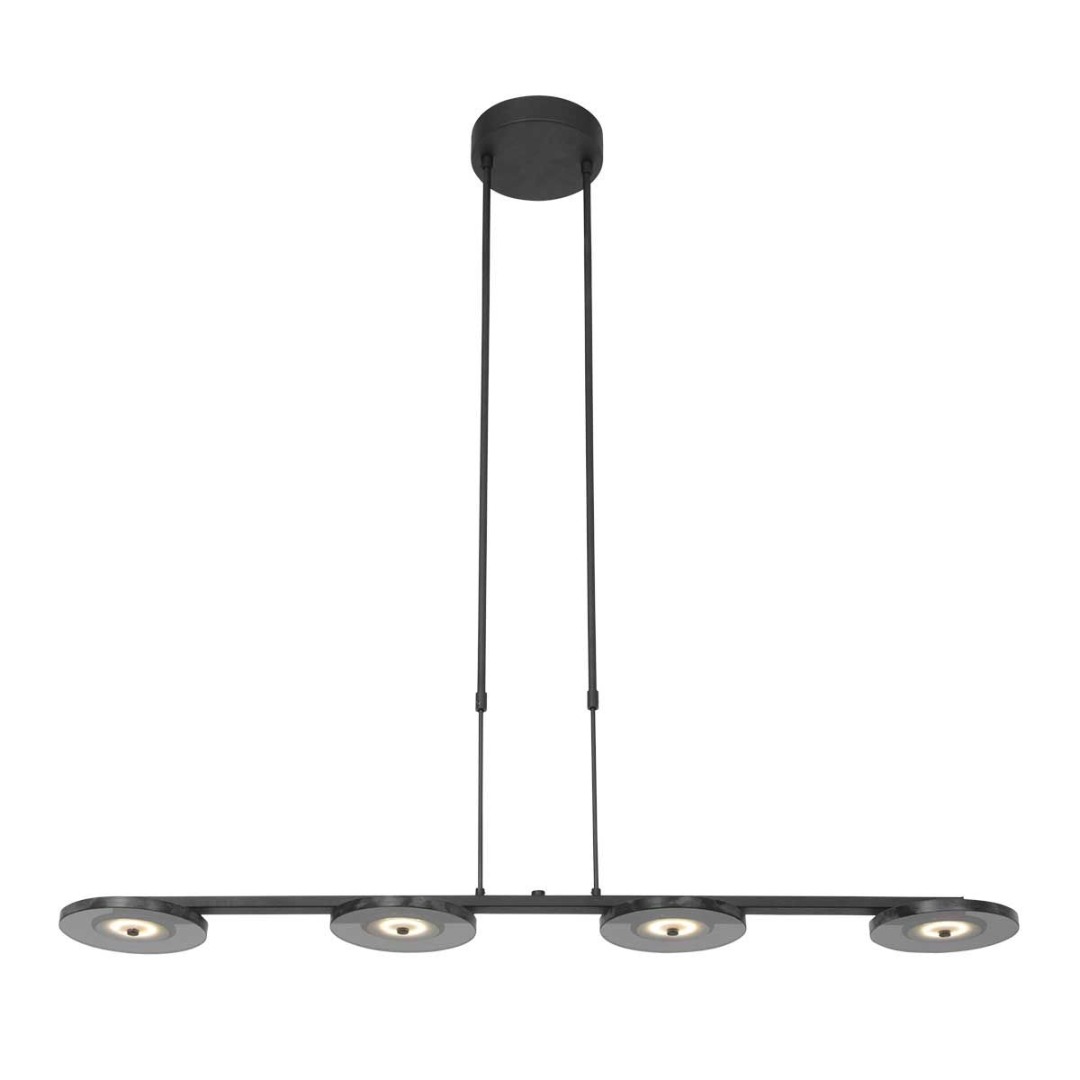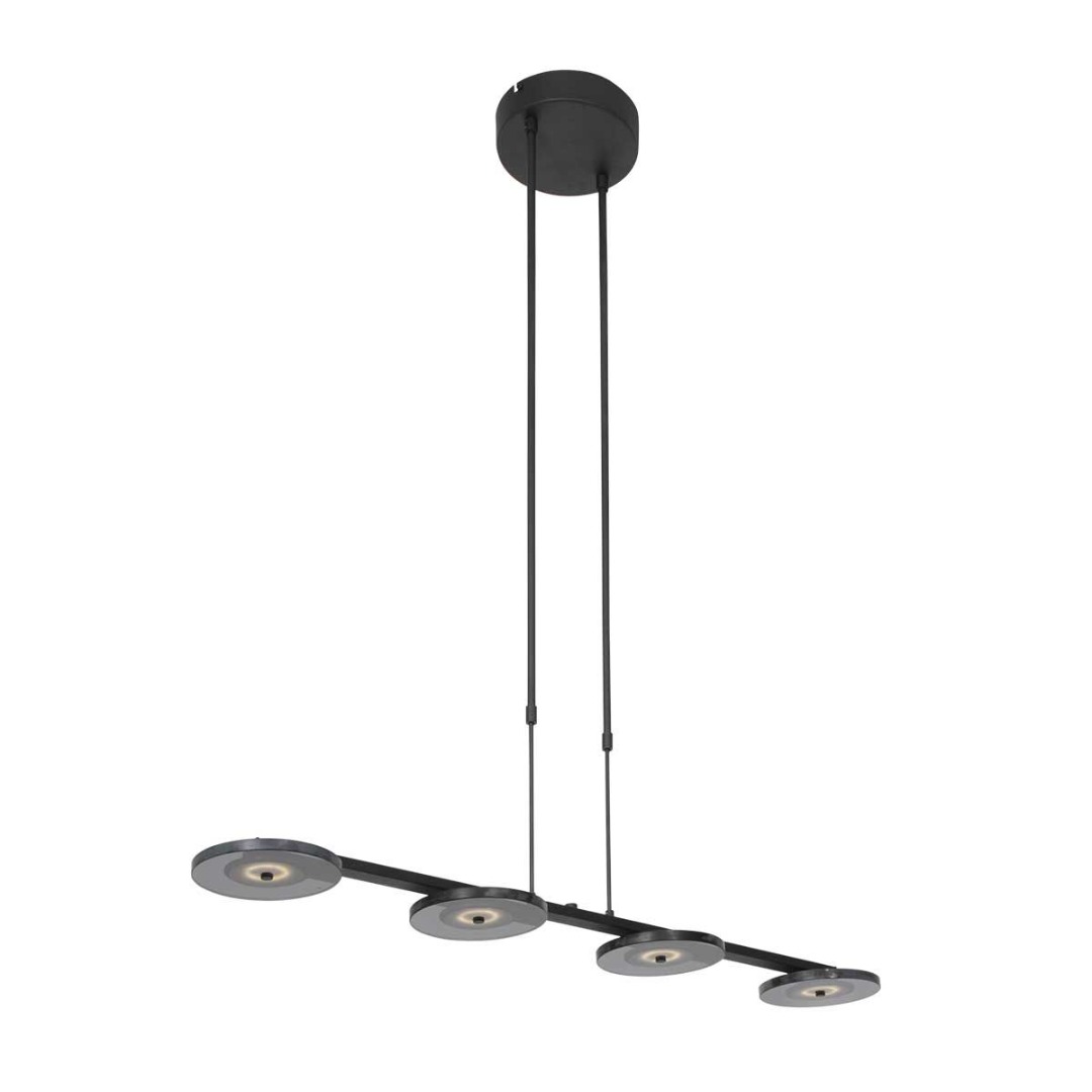 Een functionele hanglamp uit de Turound LED serie van Steinhauer. De lamp is gemaakt van metaal en glas. Een moderne en strakke uitstraling dankzij de zwarte kleur en smoke glazen van de lamp. Toepasbaar in verschillende ruimtes en interieurstijlen. De lamp komt inclusief LED lichtbronnen van 4x 10 Watt. De lamp straalt met vier lichtpunten diffuus licht uit naar beneden. U kunt de lamp dimmen middels de pushdimmer op het armatuur. Tevens is de lichtkleur instelbaar tussen 2700 - 4000K waardoor je kan afwisselen tussen warm en helder licht. Stijlvol te combineren met de andere lampen uit de Turound LED serie. De hoogte is verstelbaar tot maximaal 122 cm.