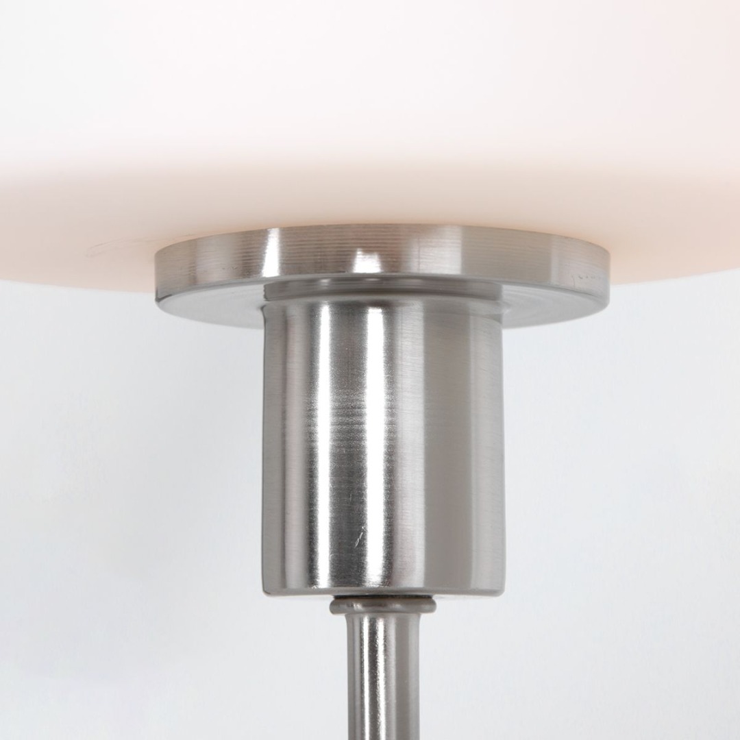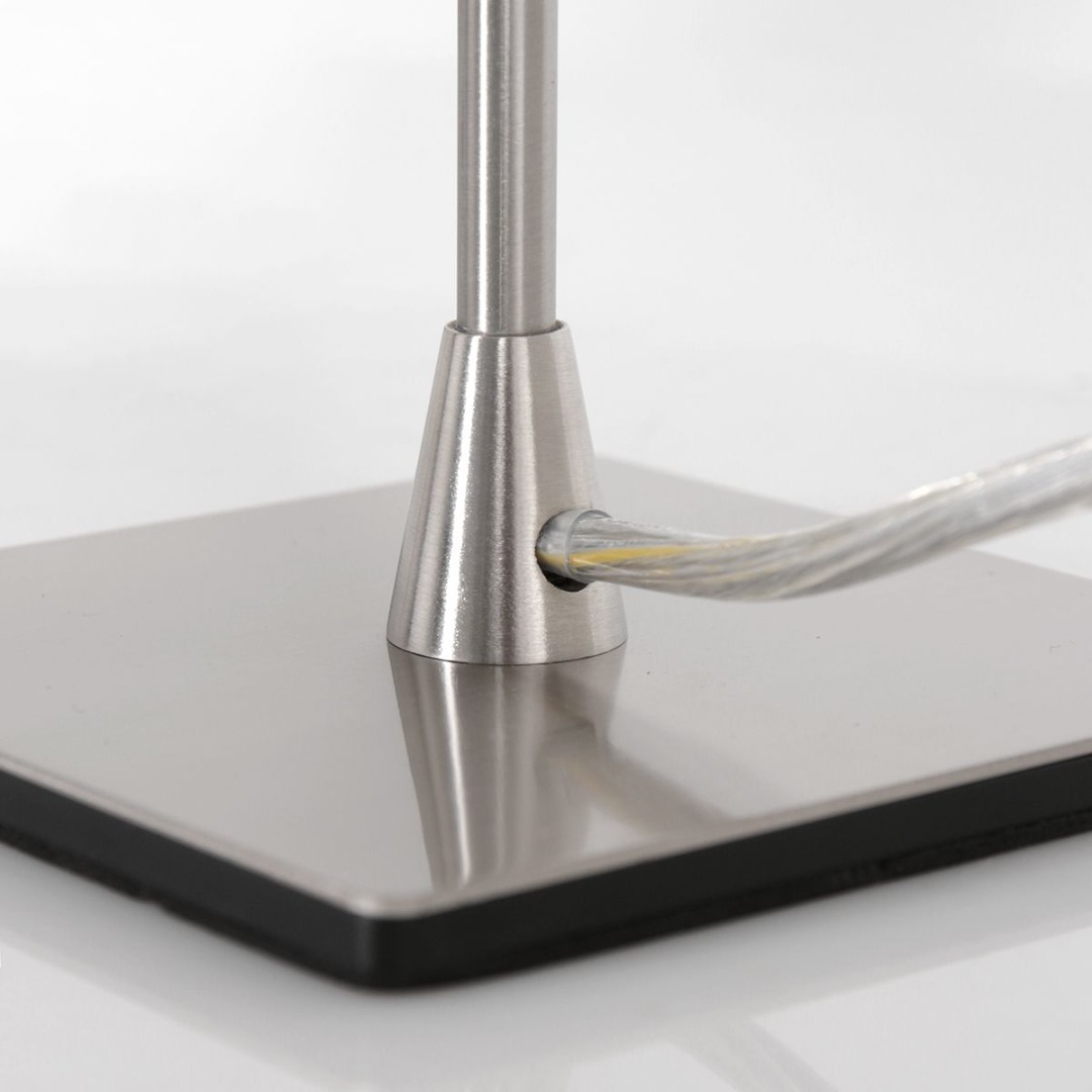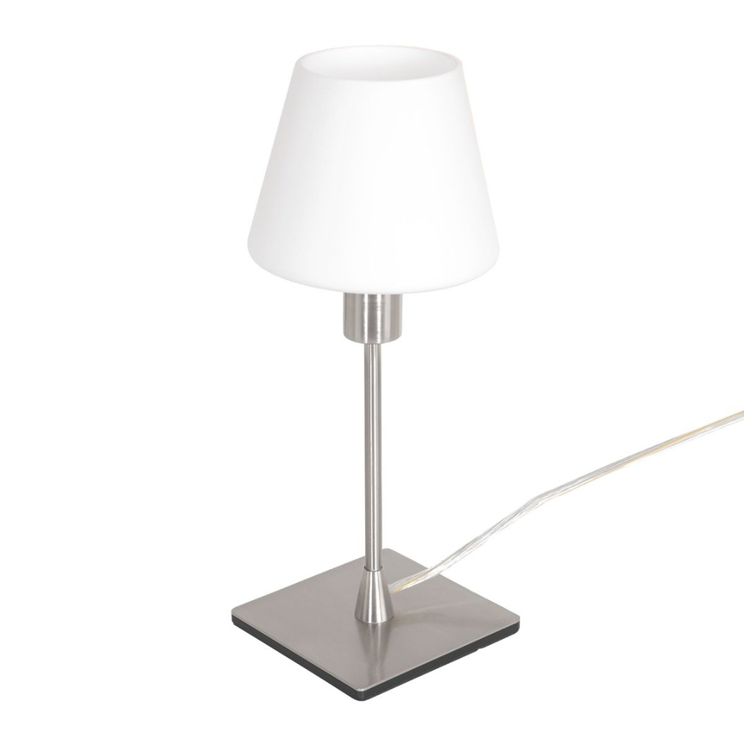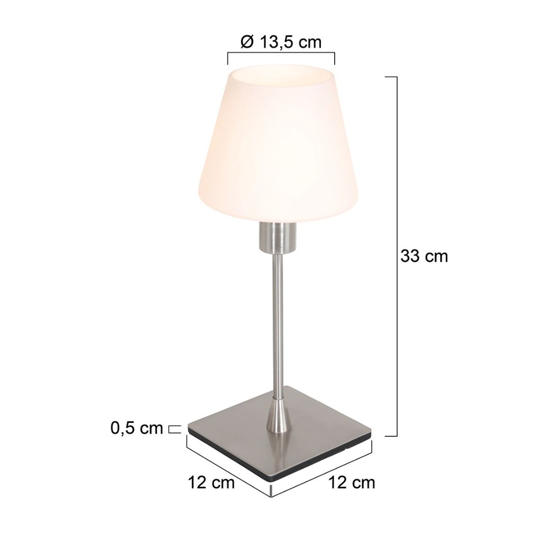 Klassieke tafellamp uit de Ancilla serie. Het model met witte kapje is tijdloos en past in verschillende interieuren. De lamp is gemaakt van staalkleurig metaal. De lamp heeft een aan- uit schakelaar waarmee de lamp gemakkelijk te bedienen is. Er kan maximaal 40 watt in de E14 fitting, de lamp is dus exclusief lichtbron.