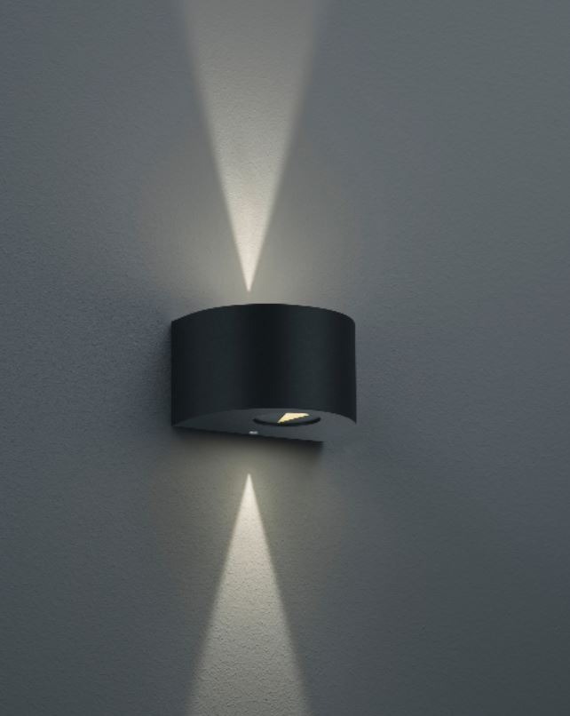 Een strak moderne wandlampje welke geschikt is voor bijna iedere buitenruimte. Deze wandlamp van het Duitse verlichtingsmerk Trio is direct klaar voor gebruik, hij wordt namelijk inclusief lichtbronnen geleverd welke gespreid licht naar boven en naar onderen geven. De lamp is gemaakt van kunststof en uitgevoerd in de kleur zwart mat. Liever een andere kleur? De Rosario is ook in wit verkrijgbaar. Met een IP-waarde van 44 is deze lamp spatwaterdicht. Door middel van de meegeleverde afdekkapjes kunt u één van de twee lichtpunten volledig afdekken of kiezen voor één van de drie verschillende lichteffecten.