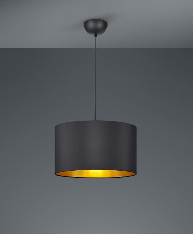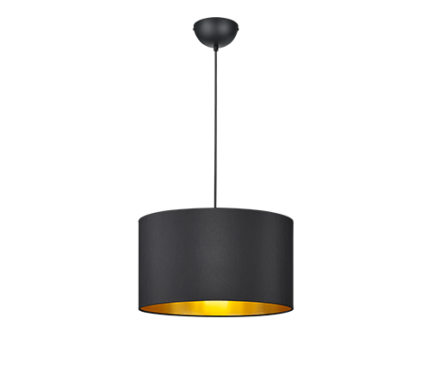Deze moderne hanglamp is gemaakt van metaal en uitgevoerd in de kleur mat zwart. De evenees mat zwarte kap welke gemaakt is van textiel, heeft een diameter van 40 cm. De binnenkant van de kap is goudkleurig. Door zijn strakke vormgeving past deze lamp van Trio in verschillende interieurs. Plaats hem bijvoorbeeld boven de eettafel in de eetkamer of woonkamer. De lamp wordt exclusief lichtbron geleverd. U kunt hierdoor zelf bepalen hoeveel licht u wilt hebben. Deze hanglamp heeft één E27-fitting die geschikt is voor een max. wattage van 60W.