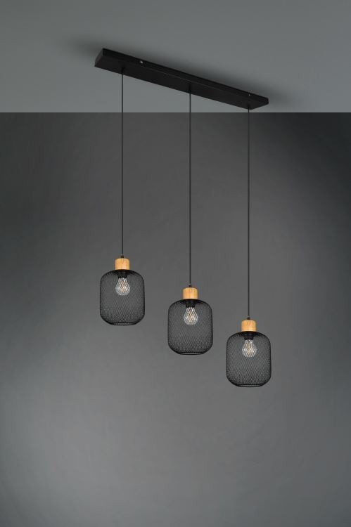 Een hanglamp van Trio uit de RL-collectie welke gemaakt is van metaal en uitgevoerd is in de kleur mat zwart. Door zijn moderne uitstraling past deze lamp in bijna elk interieur. Deze hanglamp beschikt over drie pendels, die elk afzonderlijk in hoogte verstelbaar zijn. De kappen hebben een diameter van 18 cm en bieden plaats aan een E27-fitting (geschikt voor een max. wattage van 40W). Bovenop bevindt zich een klein accent van natuurlijk materiaal (hout). De lamp is zeer geschikt om toe te passen in de woonkamer of boven de eettafel in de eetkamer om u van functioneel licht te voorzien. Deze armatuur van Trio wordt exclusief lichtbronnen geleverd. U kunt hierdoor zelf bepalen hoeveel licht u wilt hebben. De lamp kan variabel in hoogte aangepast worden.