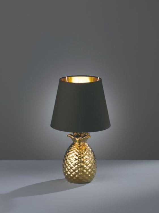 Een opvallende tafellamp van het merk Trio, die zoals zijn naam doet vermoeden de vorm heeft van de gelijknamige gezellige fruitsoort. De ananas, het internationale symbool van gastvrijheid! Deze lamp is gemaakt van keramiek en uitgevoerd in de kleur goud. De zwarte kap welke gemaakt is van textiel, heeft een diameter van 20 cm. Zelfs als deze lamp uitstaat is het een stijlvol accessoire dat de aandacht trekt. Dit schemerlampje kan goed worden geplaatst op een bureau, kast of bijzettafel, in de woonkamer of hal bijvoorbeeld. De lamp wordt exclusief lichtbron geleverd. U kunt hierdoor zelf bepalen hoeveel licht u wilt hebben. De lamp heeft één E14-fitting die geschikt is voor een max. wattage van 40W en beschikt bovendien over een snoerschakelaar.