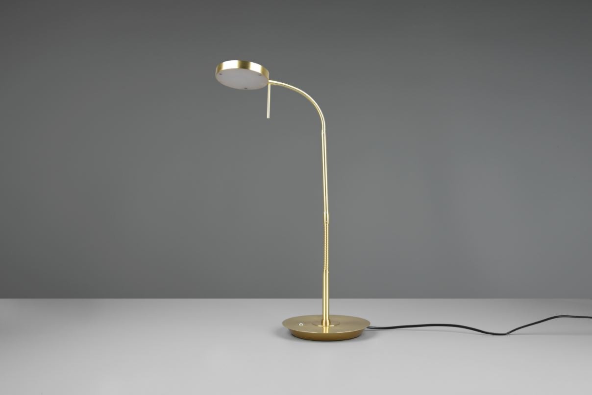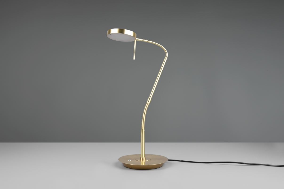 Een tafellamp van het merk Trio welke gemaakt is van metaal en uitgevoerd is in de kleur messing mat. Deze moderne bureaulamp heeft een flexibele aanpasbare arm waardoor deze gemakkelijk in functioneel licht kan voorzien. Dit maakt hem onmisbaar op het bureau in de woon- of werkkamer. Dit tafellampje wordt inclusief lichtbron geleverd, te weten een geïntegreerde SMD-LED lamp met een wattage van 12W. Deze armatuur kan door de geïntegreerde sensordimmer traploos gedimd worden. De lichtkleur (lichttemperatuur in graden Kelvin) is op verschillende niveaus instelbaar. Deze tafellamp beschikt over een geheugenfunctie, d.w.z. wanneer de lamp opnieuw ingeschakeld wordt, wordt de laatst opgeslagen instelling gebruikt.