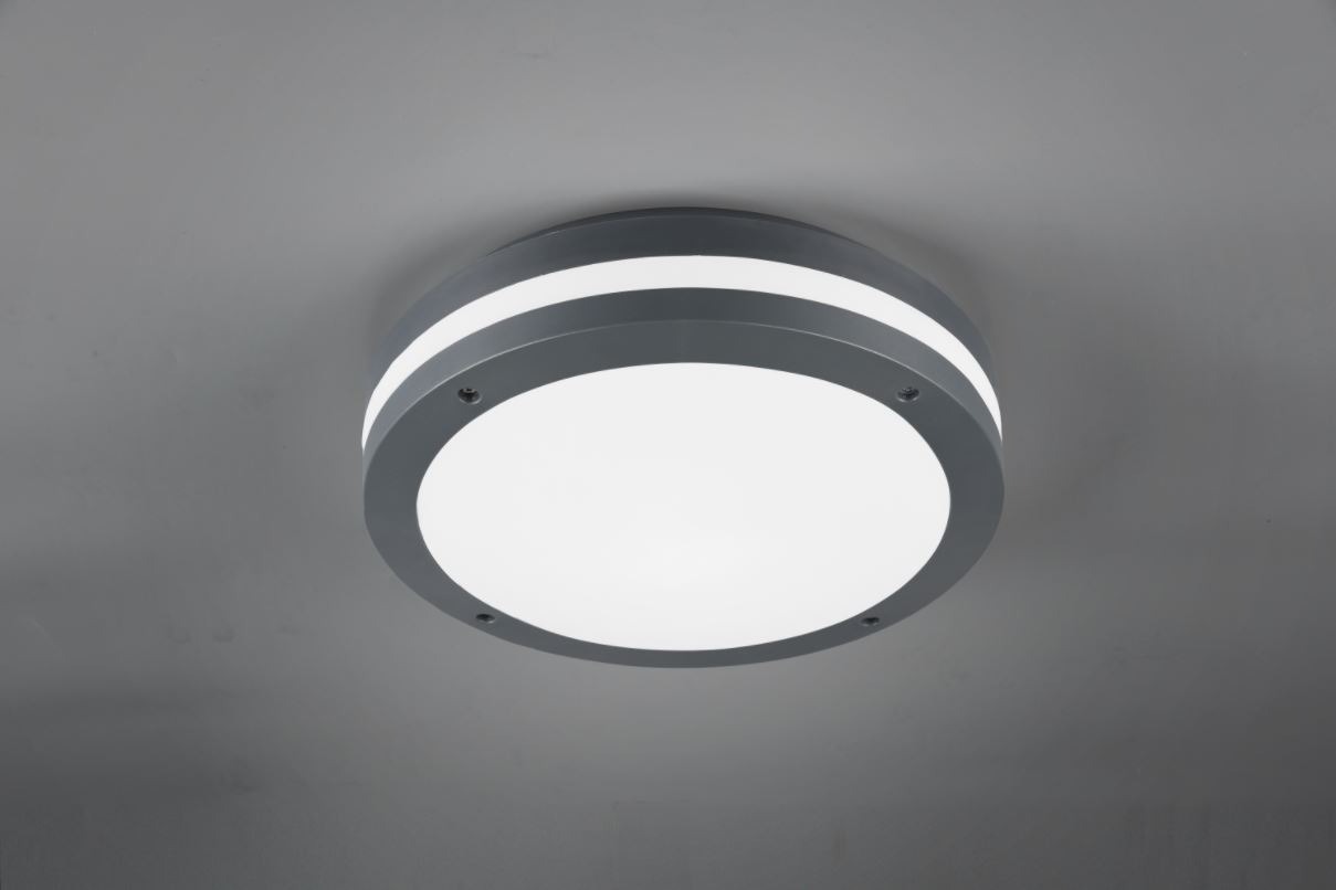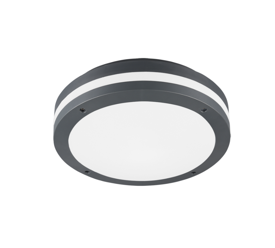 Een mooie plafondlamp voor buiten van het merk Trio. Deze elegante plafonnière is gemaakt van kunststof en uitgevoerd in de kleur antraciet. Met een IP-waarde van 54 is deze plafondlamp spatwaterdicht en stofvrij. Deze minimalistische plafondlamp kan goed onder bijvoorbeeld de overkapping geplaatst worden. Deze armatuur is overigens ook geschikt voor wandmontage. De lamp heeft een diameter van 30 cm en wordt geleverd inclusief geïntegreerde SMD-LED lamp met een wattage van 11W. De witte kap zorgt voor de verspreiding van aangenaam niet-verblindend diffuus licht. Deze armatuur schakelt automatisch in via een bewegingsmelder.