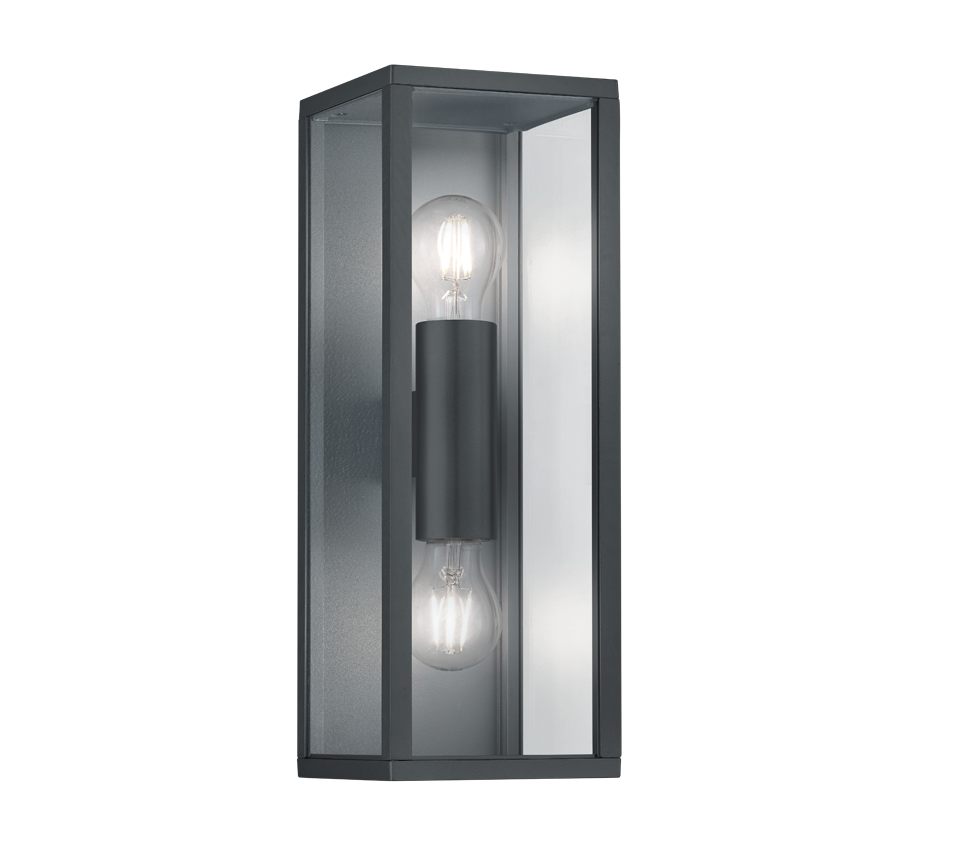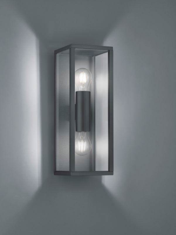Een lantaarn van het merk Trio. Deze wandlamp is gemaakt van gegoten aluminium en uitgevoerd in de kleur antraciet. Deze lamp met strakke vormgeving zal goed passen in moderne tuinen op de schutting of gevel. Deze wandlamp is met een IP-waarde van 44 spatwaterdicht. U kunt zelf bepalen hoeveel licht u wilt hebben, daar deze lamp exclusief lichtbronnen geleverd wordt. Achter het transparante glas is plaats voor twee E27-fittingen die geschikt zijn voor een max. wattage van 60W. Omdat de lichtbronnen bij deze wandlamp echt centraal staan, zou u bijvoorbeeld kunnen kiezen voor goudkleurige edisonlampjes.