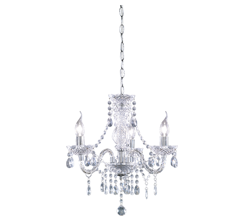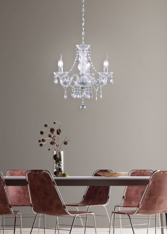 Een mooie kroonluchter van het merk Trio. Deze elegante hanglamp is gemaakt van metaal en uitgevoerd in de kleur chroom. Deze klassieke lamp kan goed worden toegepast in de hal, woonkamer of boven de eettafel in de eetkamer. Deze kroonluchter beschikt over drie armen met decoratieve hangers van transparant helder acrylglas. De hanglamp wordt exclusief lichtbronnen geleverd. Elke arm biedt plaats aan één E14-fitting (max. wattage 40W) die niet is inbegrepen, maar die afzonderlijk bijbesteld kan worden. Wij adviseren mooie tipkaarsen die gezien mogen worden.