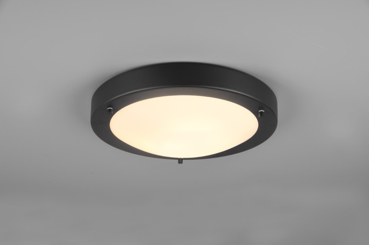 Een hoogwaardige plafondlamp van het Duitse verlichtingsmerk Trio. Een IP-waarde van 44 maakt hem zelfs bruikbaar in de badkamer. Deze algemene verlichting zorgt ervoor dat u goed zicht hebt in de badkamer. Deze modern vormgegeven plafonnière is vervaardigd uit mat zwart metaal en heeft een diameter van 31 cm. Het witte glas zorgt voor de verspreiding van aangenaam niet-verblindend diffuus licht. Een lichtbron is niet inbegrepen. De plafondlamp heeft één E27-fitting die geschikt is voor een maximaal vermogen van 60W.