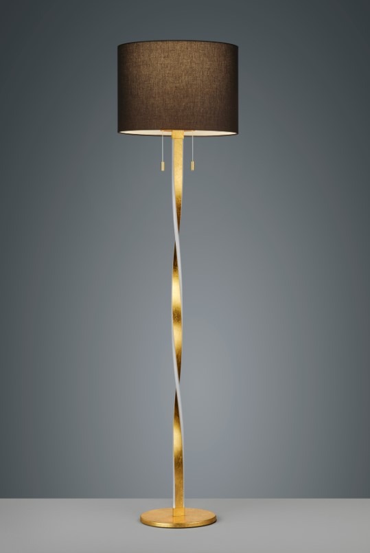 Een tijdloze vloerlamp van het Duitse verlichtingsmerk Trio. Plaats deze lamp in de woonkamer naast fauteuil of bank om een boekje naast te kunnen lezen. De twee geïntegreerde LED lampen die langs de spiraalvormige lampenvoet lopen zorgen voor sfeervol indirect licht. De lamp is gemaakt van metaal en uitgevoerd in de kleur goud. Deze vloerlamp met design uitstraling past in zowel klassieke als moderne interieurs. Deze staande lamp heeft een kap van textiel met een diameter van 40 cm. De zwarte kap biedt plaats aan één E27-fitting die geschikt is voor een maximaal vermogen van 60W. De verschillende lichtbronnen kunnen afzonderlijk aan- en uitgeschakeld worden middels de trekschakelaars.