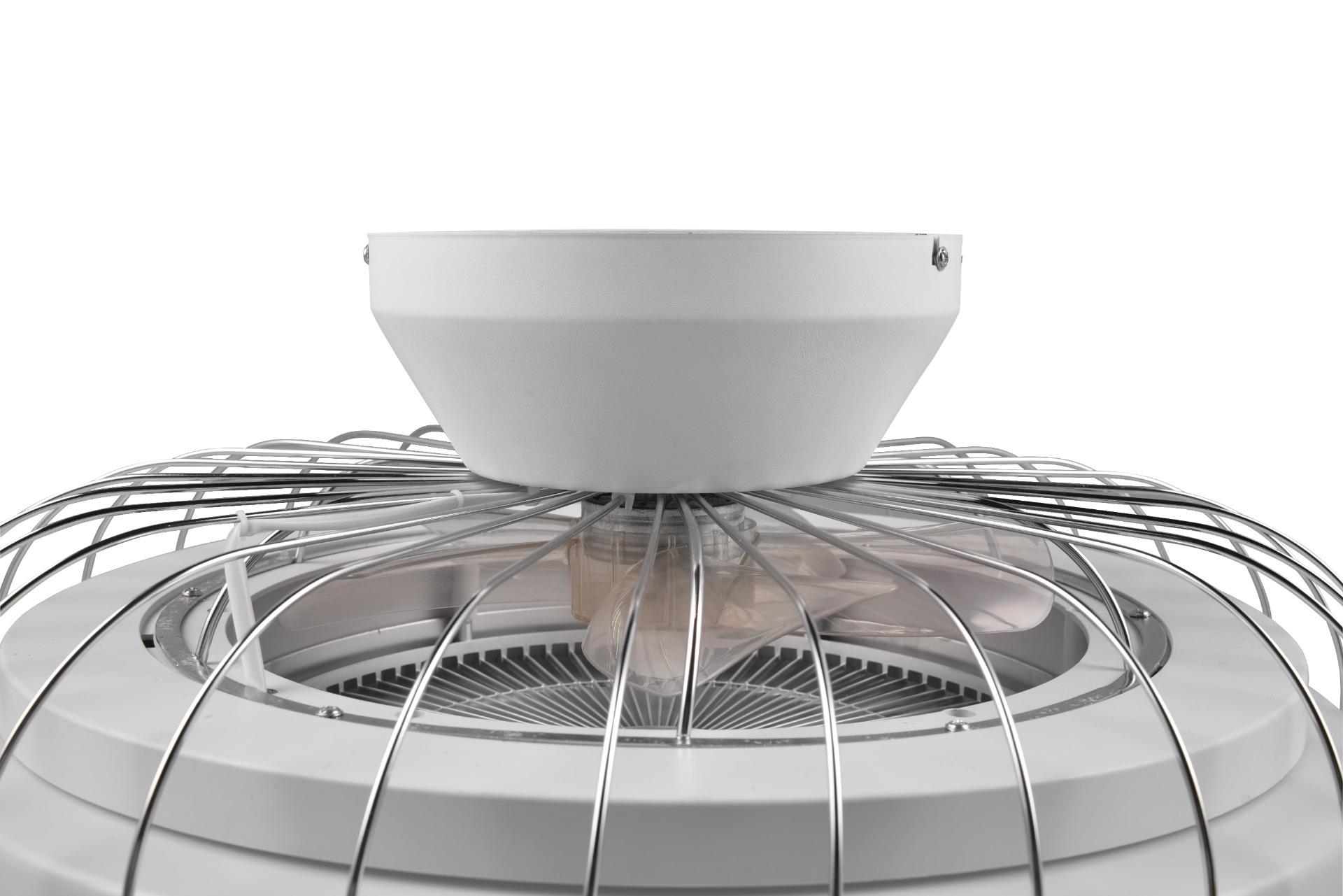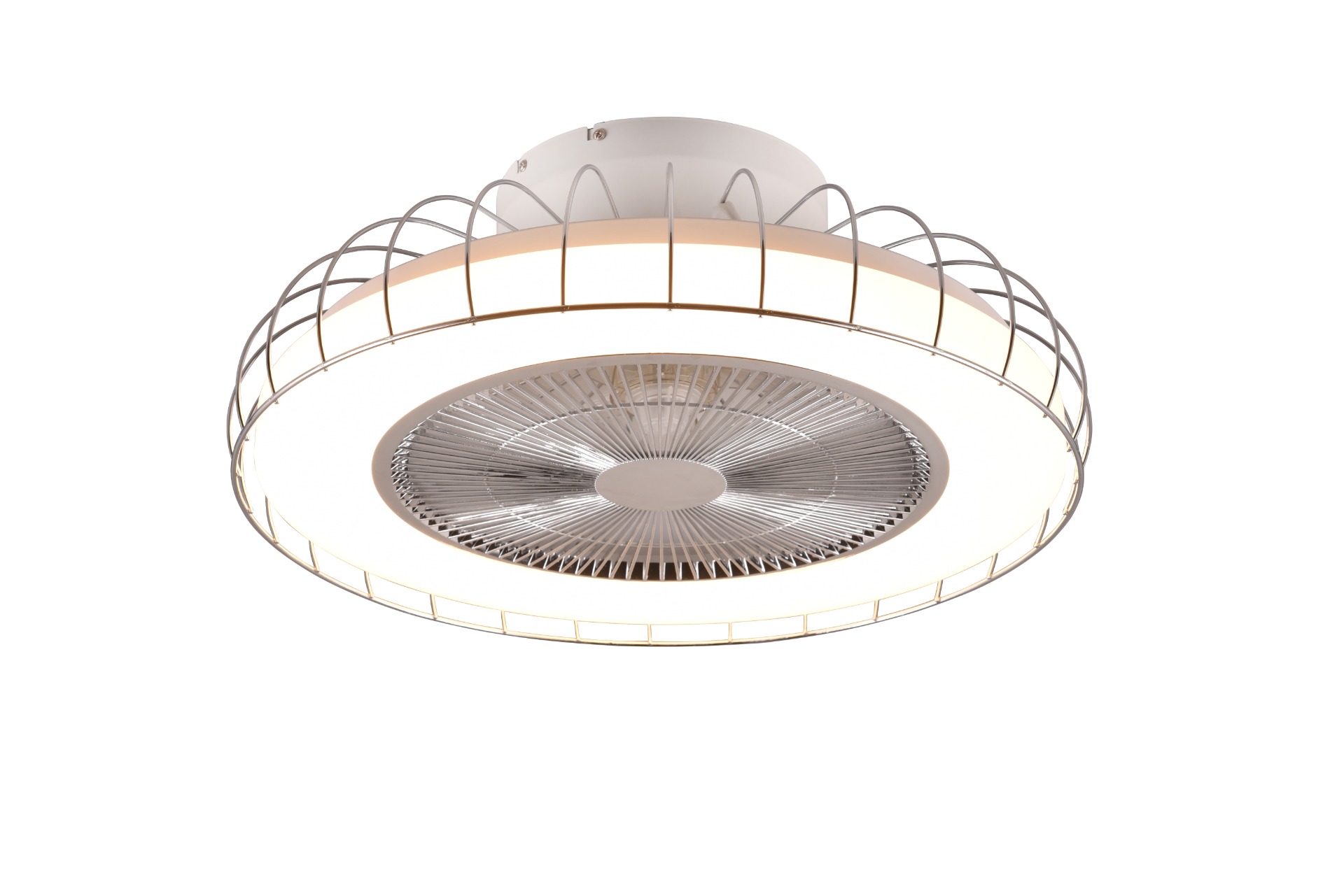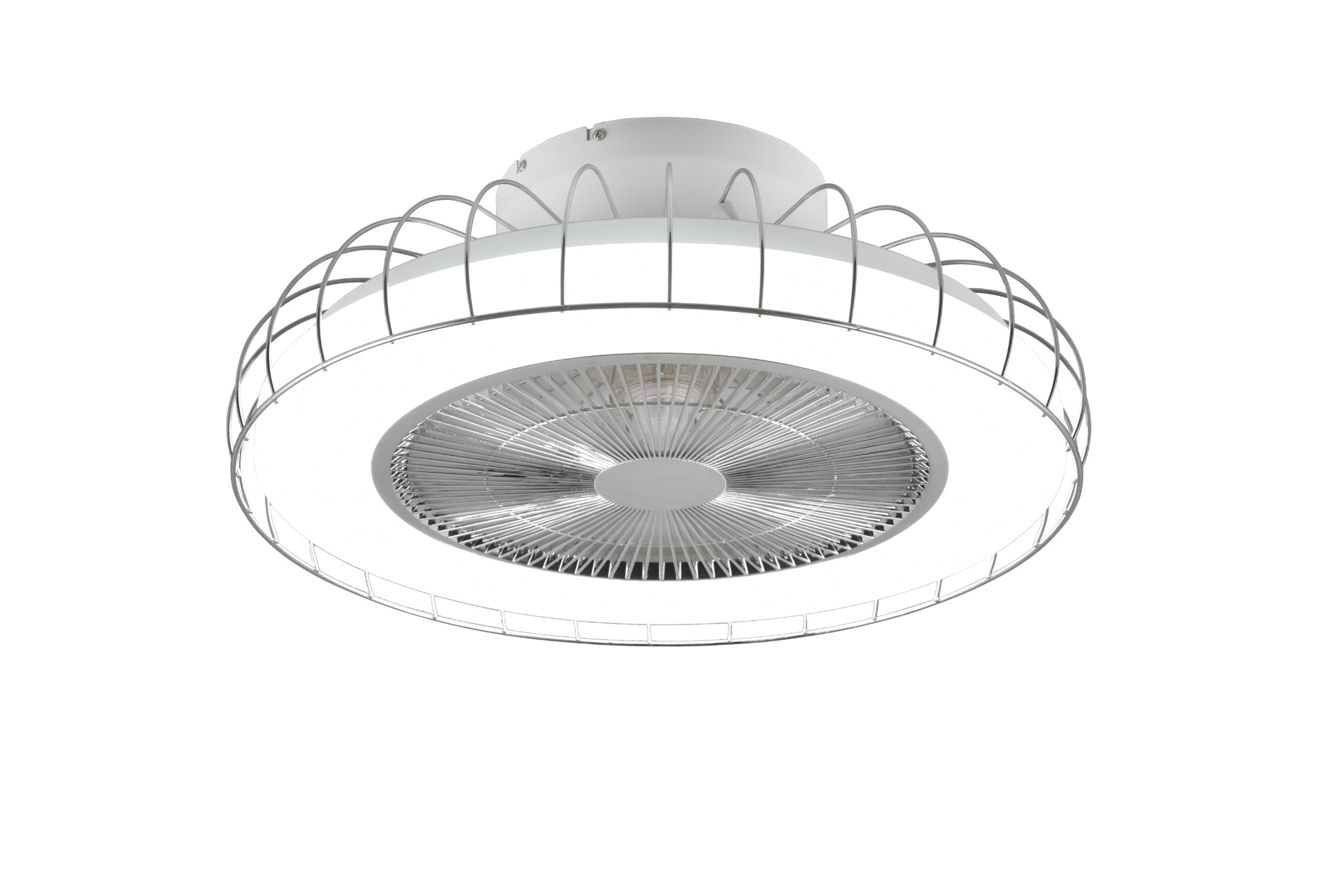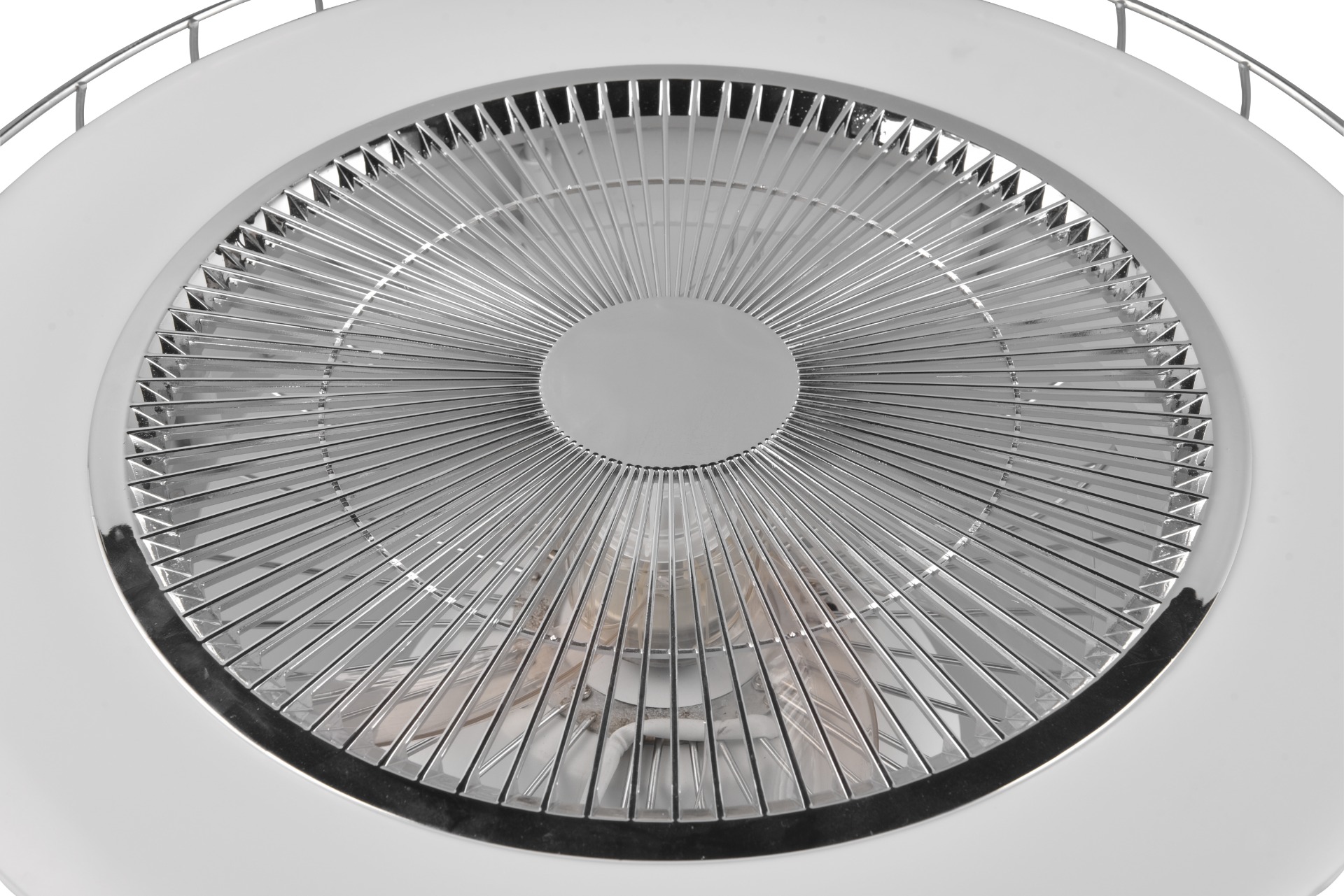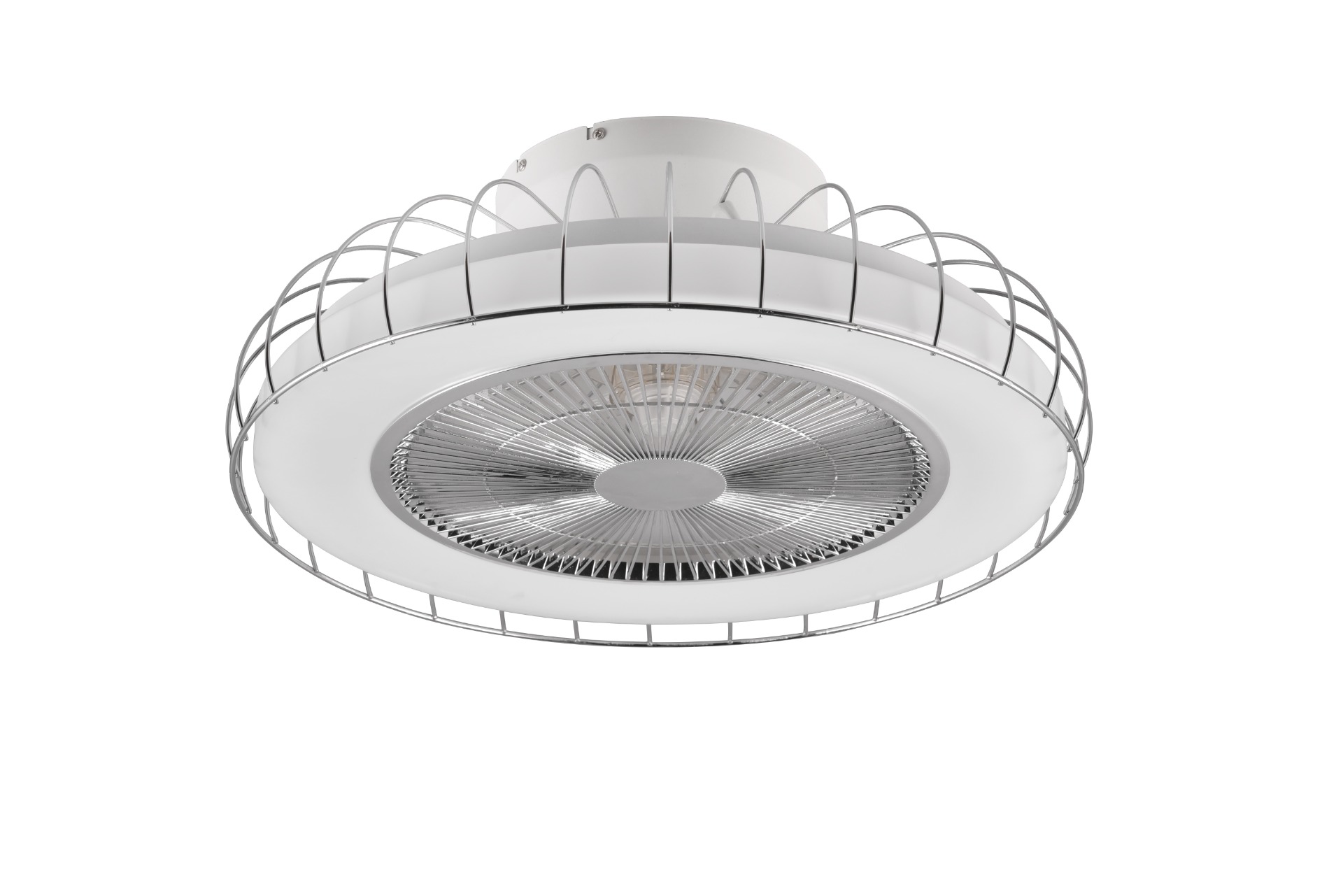 Deze ventilator van Trio is gemaakt van chroomkleurig metaal en wit kunststof. Naast de verluchting van de ruimte zorgt deze plafondventilator ook voor licht. Deze ventilatorlamp is voorzien van een geïntegreerde SMD-LED lamp met een wattage van 30W. De lichtkleur (lichttemperatuur in graden Kelvin) is traploos instelbaar middels de geïntegreerde dimmer. Deze ventilator is WiZ Connected. Deze slimme lichtregeling biedt veel mogelijkheden via app en spraakbesturing. Dankzij de timerfunctie is het mogelijk om de ventilator op vastgelegde tijdstippen automatisch in- en uit te schakelen. Deze armatuur kan niet op een externe dimmer geplaatst worden. Met de meegeleverde afstandsbediening is de ventilator gemakkelijk te bedienen. Er zijn drie snelheidsniveaus en een zomer- en winterstand. Deze armatuur heeft bovendien een nachtlampfunctie en een geheugenfunctie (dit wil zeggen dat de laatste instelling opgeslagen en gebruikt wordt wanneer de lamp opnieuw ingeschakeld wordt).