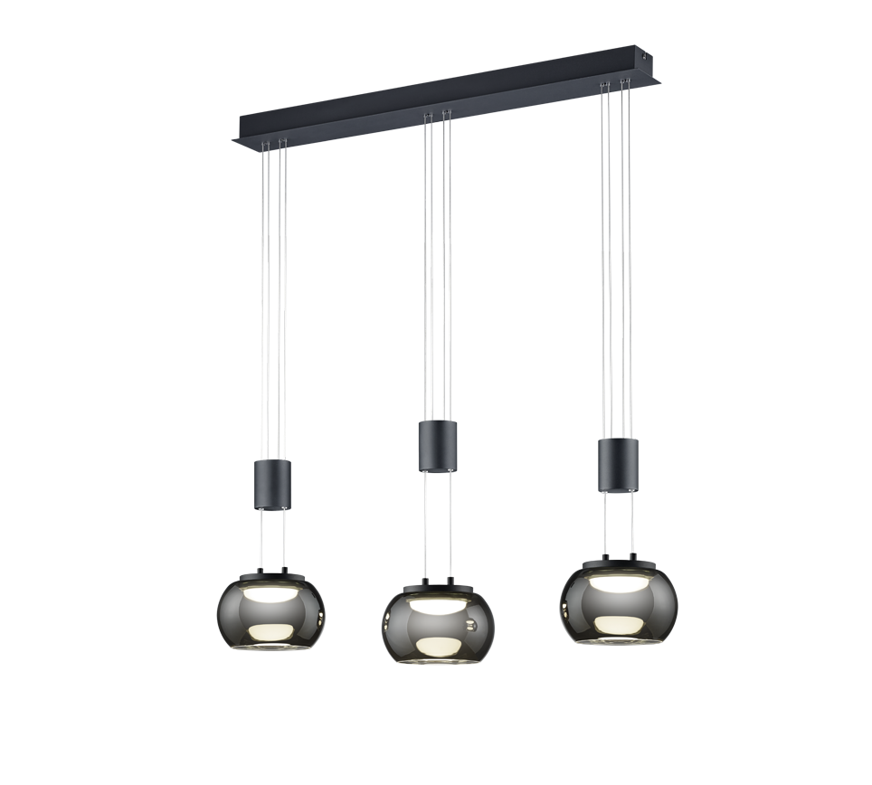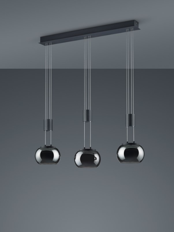 De Madison-serie van Trio is modern vormgegeven. De armaturen zijn elegant en eenvoudig. De serie is er in 4 kleurstellingen en bestaat uit hanglampen (1-, 2- en 3-lichts) en tafellampen. Deze hanglamp is bijzonder effectief als centraal element in het midden boven de eettafel. De sierlijke glazen kappen zijn individueel in hoogte verstelbaar. Elke kap beschikt over een geïntegreerde LED lamp. Met de conventionele lichtschakelaar kan er gekozen worden voor 3 lichtsterkteniveaus (25%, 50% en 100%). Dit zorgt altijd voor de juiste lichtsfeer. De lamp is vervaardigd uit mat zwart metaal. De kappen zijn gemaakt van verchroomd glas en hebben een diameter van 18 cm. Let wel, deze hanglamp dient op een normale lichtschakelaar geplaatst te worden en is niet geschikt voor een externe dimmer.