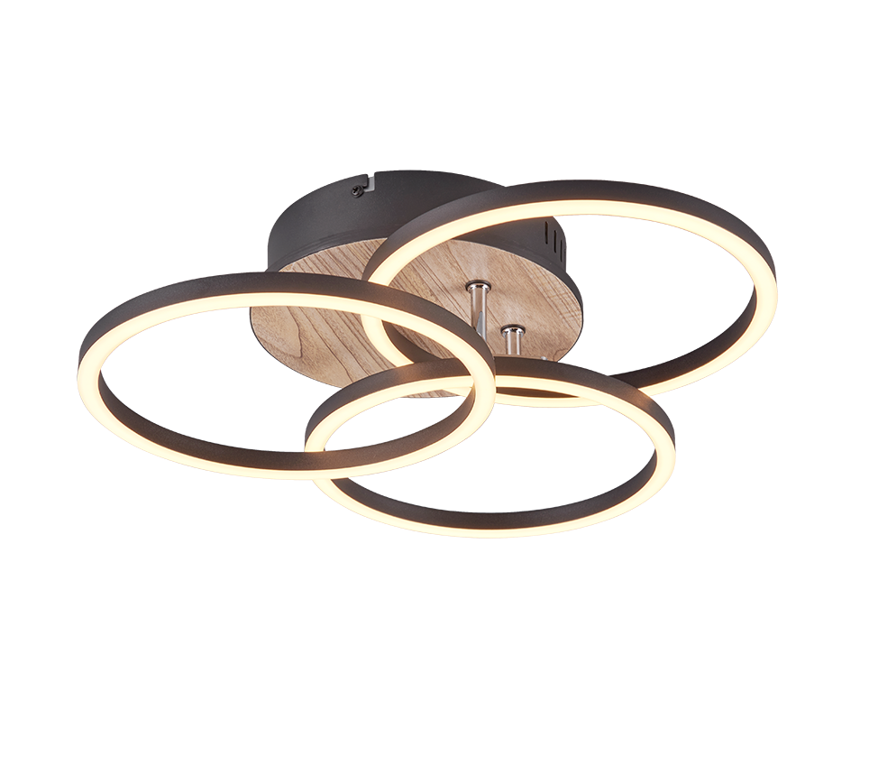 Een moderne plafondlamp van het merk Trio. Deze plafonnière is gemaakt van metaal en heeft een accent van houtlook. De lamp beschikt over verstelbare armen. De lamp kan goed worden toegepast in verschillende binnenruimtes, zoals bijvoorbeeld in de slaapkamer, woonkamer of ruime hal als basisverlichting. Deze plafondlamp wordt inclusief lichtbron geleverd, te weten een geïntegreerde SMD-LED lamp met een wattage van 27W. De lichtkleur (lichttemperatuur in graden Kelvin) van deze armatuur kan door de geïntegreerde dimmer traploos ingesteld worden. Bediening gaat gemakkelijk via de meegeleverde afstandsbediening. Deze plafonnière beschikt over een nachtfunctie. Let wel, deze plafondlamp dient op een normale lichtschakelaar geplaatst te worden en is niet geschikt voor een externe dimmer.
