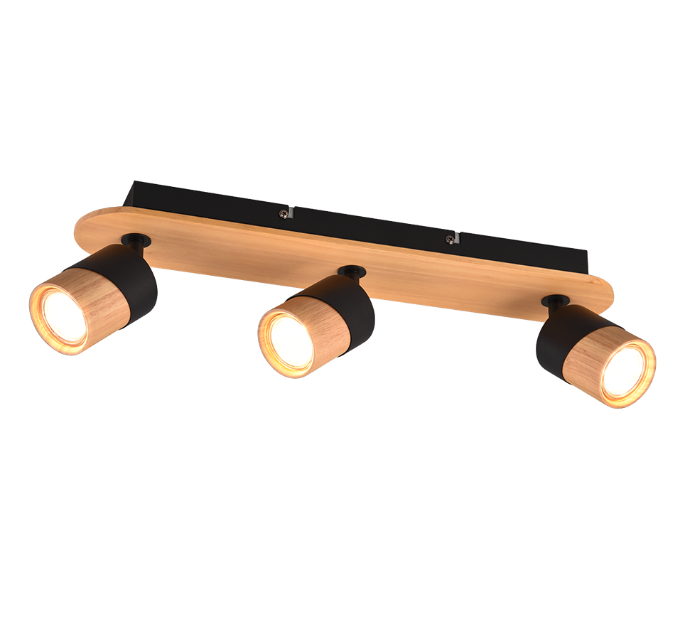 Een hoogwaardige opbouwspot van het Duitse verlichtingsmerk Trio. De combinatie van het hout met het zwarte metaal geeft de spot een moderne uitstraling. Deze opbouwspot is ideaal als algemene verlichting. De lichtbundels van deze beweegbare spots kunnen eenvoudig in de juiste richting worden gericht. De opbouwspot heeft drie lichtbronnen nodig welke niet worden meegeleverd maar die eenvoudig afzonderlijk bijbesteld kunnen worden. Wij adviseren LED spots met een maximaal wattage van 5W.