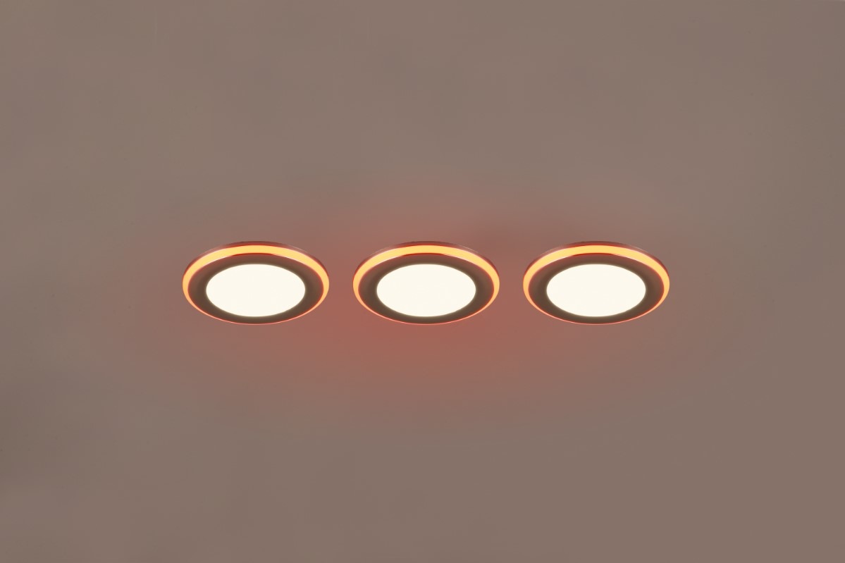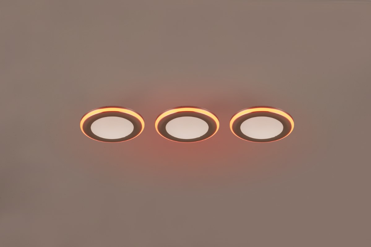Moderne inbouwspots welke ook voor wandmontage geschikt zijn. Deze spots zijn vervaardigd uit chroomkleurig kunststof en worden inclusief lichtbronnen geleverd welke apart schakelbaar zijn. Met de meegeleverde afstandsbediening kan de centrale lichtbron (4W, 350lm, 3000K) traploos gedimd worden. Met de RGBW-kleurenwisselaar kan de buitenste cirkel gekleurd (rood, groen, blauw, wit) licht uitstralen. Dankzij de geheugenfunctie wordt de laatste instelling opgeslagen en gebruikt wanneer de lamp opnieuw wordt ingeschakeld. Let wel, deze inbouwspots dienen op een normale lichtschakelaar geplaatst te worden en zijn niet geschikt voor een externe dimmer.