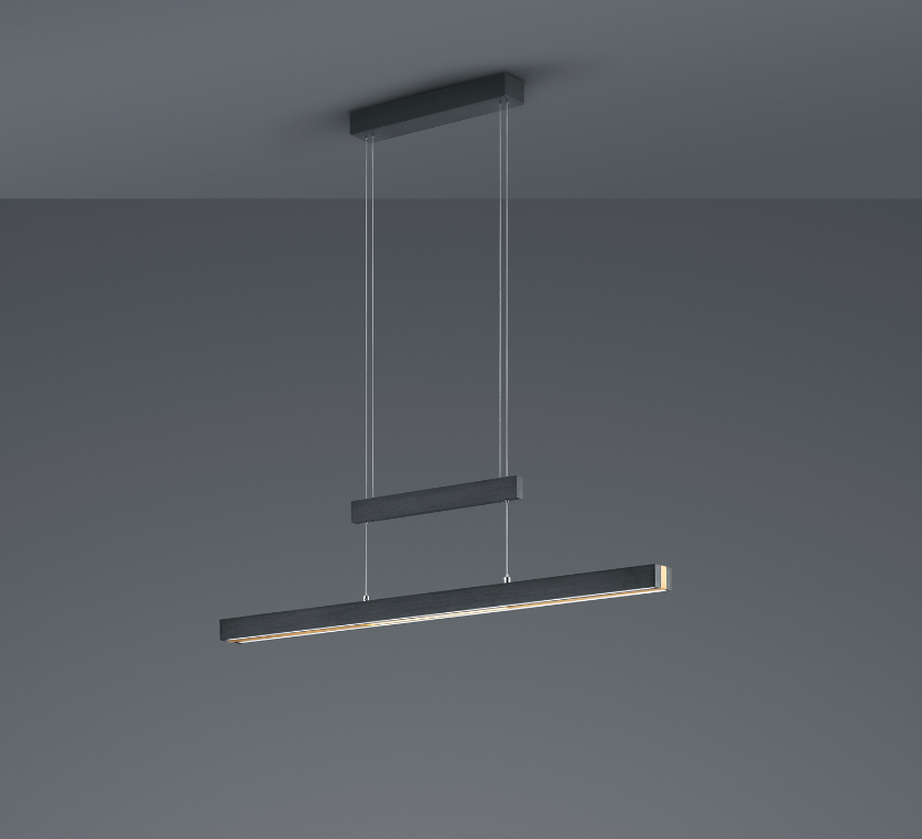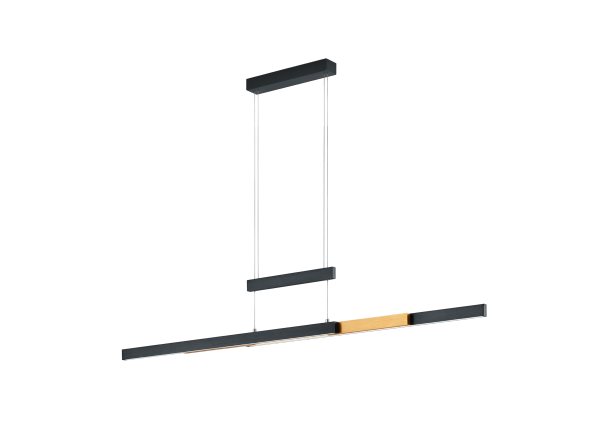 Een moderne hanglamp van het merk Trio, gemaakt van metaal. De lamp heeft een ingebouwde SMD-LED lamp met een wattage van 45W. De lamp is een goed voorbeeld van een lamp die goed staat boven de eettafel in de eetkamer. Deze hanglamp verspreidt licht zowel naar boven als naar beneden, wat zorgt voor sfeervolle en harmonieuze lichteffecten. Het tweekleurige design in mat zwart en messing mat sluit goed aan bij moderne interieurstijlen en kleurenschema's. De lamp heeft een touch dimmer waarmee de lamp op 4 manieren gedimd kan worden (4-way touch). Let wel, deze hanglamp dient op een normale lichtschakelaar geplaatst te worden en is niet geschikt voor een externe dimmer. Deze hanglamp is verstelbaar in zowel hoogte als breedte. ook verkrijgbaar in andere kleuren zoals : geborsteld aluminium, messing mat of nikkel mat