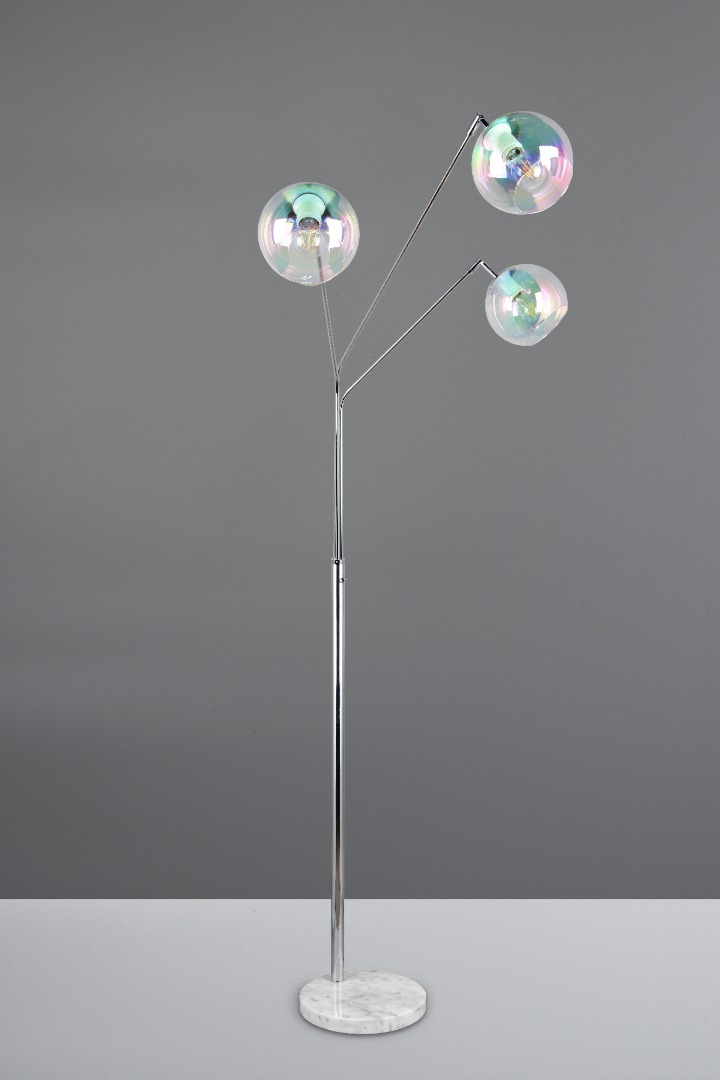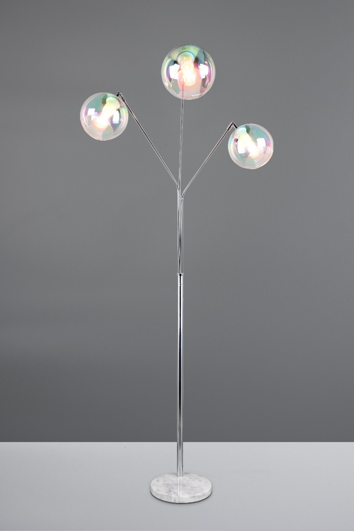 Een fraaie vloerlamp met een modern/retro-achtige uitstraling van het Duitse verlichtingsmerk Trio, uitgevoerd in een chroomkleurige metalen behuizing met transparant iriserend glas. De lamp wordt geleverd exclusief lichtbronnen met drie E27 fittingen, geschikt voor maximaal 3x 10W. Deze vloerlamp is ideaal voor bijvoorbeeld de woonkamer of slaapkamer en komt bijzonder mooi tot zijn recht in een hoek van de ruimte. Voorzien van een handige aan- en uitschakelaar op het armatuur en een IP20-classificatie, wat betekent dat de lamp bestand is tegen stof. De vloerlamp is ook verkrijgbaar in een uitvoering met zwart-gouden kleur en amberkleurig glas.