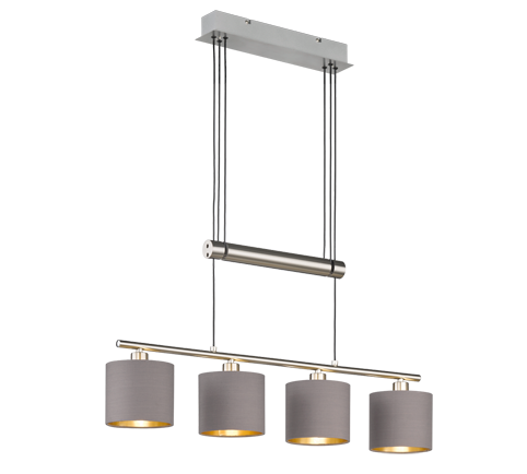 Een moderne hanglamp van het merk Trio. Deze hanglamp is gemaakt van metaal en uitgevoerd in de kleur nikkel mat. De lamp kan goed worden toegepast in de woonkamer of boven de eettafel in de eetkamer. Deze hanglamp beschikt over vier taupekleurige kappen welke gemaakt zijn van textiel. De kappen hebben een diameter van 13,5 cm. Elke kap biedt plaats aan een E14-fitting die geschikt is voor een max. wattage van 28W. Deze hanglamp is in hoogte verstelbaar.