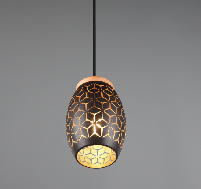 Een hanglamp van het Duitse verlichtingsmerk Trio. De lamp is gemaakt van metaal en heeft een mooie zwart-gouden kleur met een hout element aan de bovenkant van de kap. Er kan één lichtbron met fittingmaat E27 in geplaatst worden van max. 28W (exclusief). De hanglamp kan goed worden geplaatst in de woonkamer, slaapkamer of eetkamer boven een eettafel. De lamp is tijdens installatie op de gewenste hoogte te hangen. Door het motief in de kap geeft deze lamp een leuke lichtspreiding.