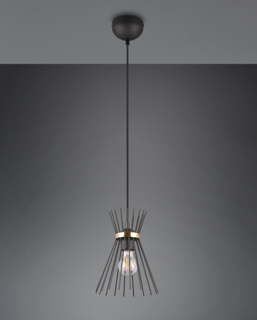 Een hanglamp met moderne uitstraling van het Duitse verlichtingsmerk Trio. De hanglamp is gemaakt van metaal en heeft een zwart met gouden kleur. De lamp wordt geleverd exclusief lichtbron met E27 fitting geschikt voor max. 40W. De lamp kan goed worden geplaatst in bijvoorbeeld de eetkamer boven een eettafel, of elders in de woonkamer. De lamp is tijdens installatie op gewenste hoogte te hangen.