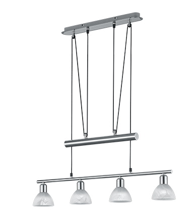 Een stijlvolle hanglamp van het merk Trio. Deze moderne lamp met een mooi design is gemaakt van glas en metaal. U kunt de hanglamp goed toepassen in de woonkamer of boven en lange eettafel in de eetkamer. Uitgevoerd in de kleur Nikkel mat met albastkleurige glas, deze combinatie kunt u goed in een moderne of klassieke interieur plaatsen. Daarnaast is de hanglamp eenvoudig in de hoogte verstelbaar door zijn jojo-pendel. Deze hanglamp geeft een prettige sfeer en is daarnaast ook functioneel door zijn jojo-pendel. De lamp wordt inclusief 4x E14 LED lichtbron geleverd met een wattage van 4,9W. Deze hanglamp is niet dimbaar.