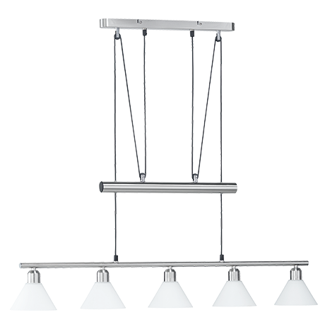 Een moderne hanglamp van het merk Trio. Deze stijvolle lamp met een mooi design is gemaakt van glas en metaal. U kunt de hanglamp goed toepassen in de woonkamer of boven en lange eettafel in de eetkamer. Uitgevoerd in de kleur nikkel-mat met opaalwit glas, deze combinatie kunt u goed in een moderne of klassieke interieur plaatsen. Daarnaast is de hanglamp eenvoudig in de hoogte verstelbaar van 80 tot 180 centimeter. Deze hanglamp geeft een prettige sfeer en is daarnaast ook functioneel door zijn pendel. De lamp wordt exclusief lichtbron geleverd. Er zitten exclusief 5x E14 fittingen in geschikt voor ieder max. 40W.