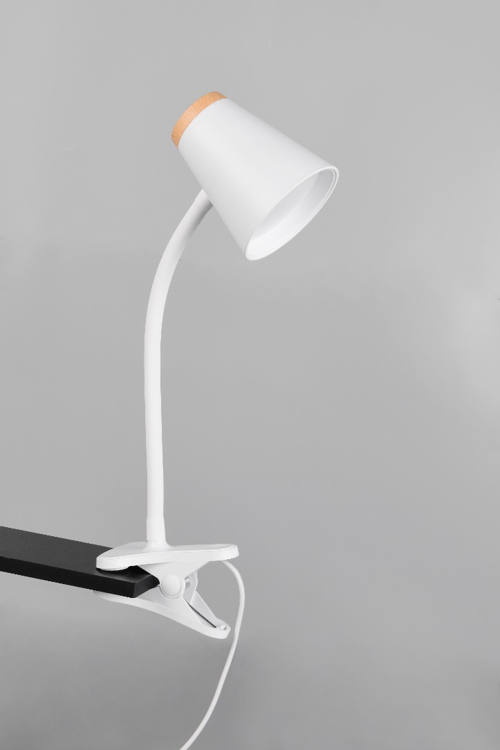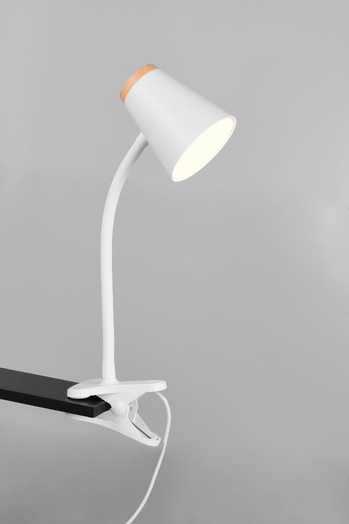 Een handige klemlamp uit de RL collectie van het Duitse merk Trio. De Pongo klemlamp heeft een hoogte van 33 cm en wordt geleverd inclusief energiezuinige SMD LED-verlichting. Aan de achterzijde van de kap bevindt zich een handige aan/uit-schakelaar voor eenvoudig gebruik. Dankzij de flexibele, verstelbare arm kunt u de lamp eenvoudig in de gewenste positie buigen, ideaal voor lezen, werken of sfeerlicht. De lamp is gemaakt uit wit kunststof en is aan de achterzijde afgewerkt met een imitatie houten detail. Deze combinatie zorgt voor een moderne, maar landelijke uitstraling die perfect past in elke ruimte. Met een IP20-classificatie is de Pongo geschikt voor gebruik in droge, stofvrije omgevingen. De klemlamp kan worden geklemd op bijv. een tafel of bureau met een dikte tussen de 1-3 cm.