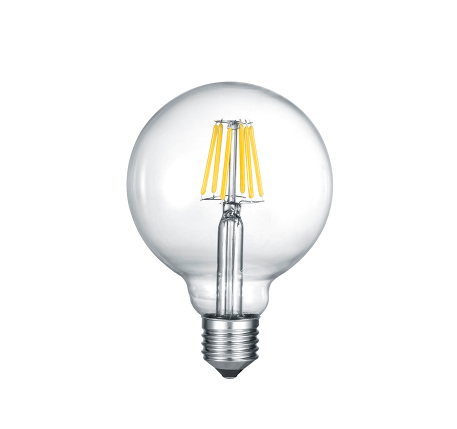 Een mooie transparante LED lamp met globe vorm en filament van het Duitse verlichtingsmerk Trio. Deze lichtbron is gemaakt van metaal en glas. Deze lamp heeft een E27-fitting (grote fitting) en een wattage van 7W. De lichtopbrengst bedraagt 806 lumen en de lichttemperatuur is 2700 Kelvin (warm wit). De lamp is niet dimbaar.