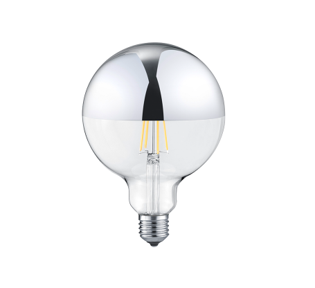 Een mooie LED lamp met Globe vorm en kopspiegel van het Duitse verlichtingsmerk Trio. Deze lichtbron is gemaakt van glas en heeft een chromen kleur aan de bovenste helft. Dit zorgt voor mooi indirect licht. Deze lamp heeft een E27-fitting (grote fitting) en een wattage van 7W. De lichtopbrengst bedraagt 680 lumen en de lichttemperatuur is 2700 Kelvin (warm wit). De lamp is extern dimbaar (aanbevolen dimmer; universele LED dimmer faseafsnijding/ 2draadssysteem).