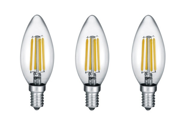 Een mooie set van 3 energiezuinige LED lampen met kaars vorm van het Duitse verlichtingsmerk Trio. Deze lichtbron is gemaakt van glas in een transparante-heldere kleur. Deze lamp heeft een E14-fitting (kleine fitting) en een wattage van 2W. De lichtopbrengst bedraagt 250 lumen en heeft een kleurtemperatuur van 2700K (warm wit). De lamp is niet dimbaar.