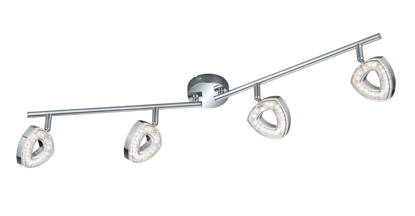 De Tours is een mooie opbouwspot met glinsterende effecten uit de RL collectie van Trio. De lamp kan goed worden toegepast in de woonkamer of eventueel slaapkamer. De lamp wordt inclusief SMD-LED lichtbronnen geleverd met een wattage van 4x 4,5W. Het licht dat deze lichtbronnen produceert heeft een warmte van 3000K en 4x 400 lumen. De lamp is gemaakt van metaal in de kleur chroom en de kappen van kunststof in transparant helder.