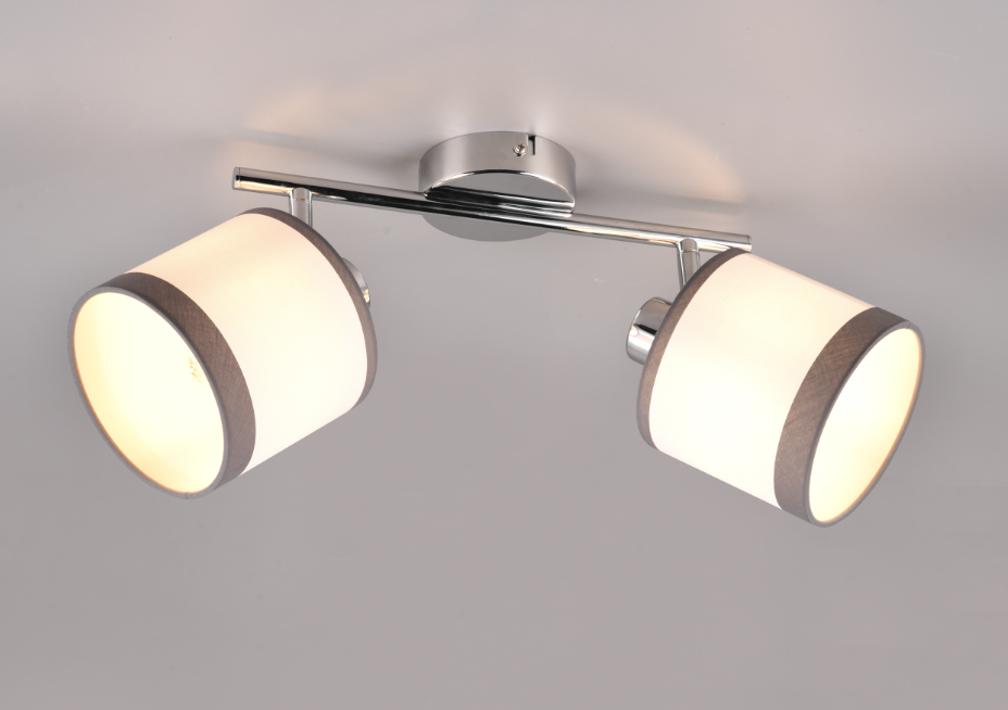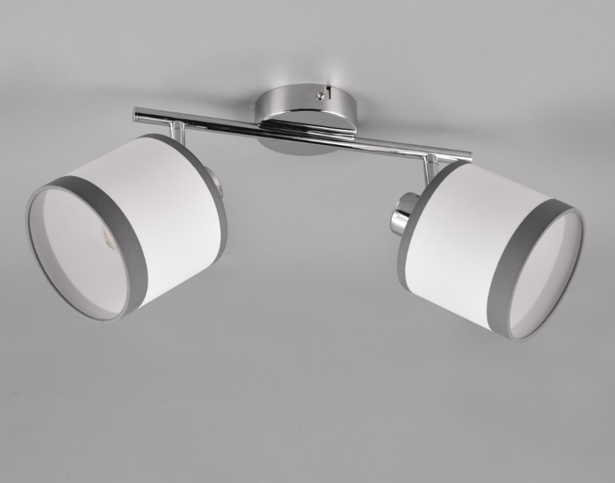 Een spotlamp van het Duitse verlichtingsmerk Trio. De lamp is gemaakt van metaal met een textiel kap en heeft een mooie chromen kleur met witte kap. Er kunnen twee lichtbronnen met fittingmaat E14 in geplaatst worden van max. 2x 10W (exclusief). De spot kan goed worden geplaatst in verschillende ruimtes zoals hal, slaapkamer en woonkamer, om bijvoorbeeld te zorgen voor mooie accentverlichting.