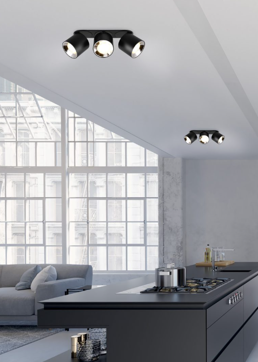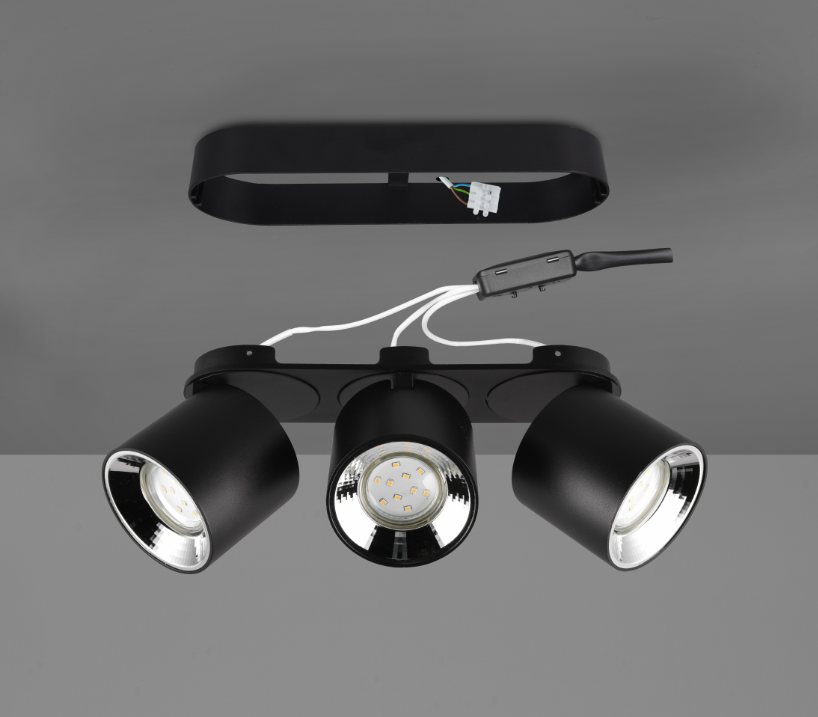 Een spotlamp van het Duitse verlichtingsmerk Trio. De lamp is gemaakt van metaal in een compleet mat zwarte kleur. Er kunnen drie lichtbronnen met fittingmaat GU10 in geplaatst worden van max. 3x 10W (exclusief). De spot is geschikt voor plafondmontage en kan op twee manieren worden bevestigd (zie foto's), direct op het plafond of met een stuk ertussen. De spot kan goed worden geplaatst in verschillende ruimtes zoals hal, slaapkamer en woonkamer, om bijvoorbeeld te zorgen voor mooie accentverlichting.