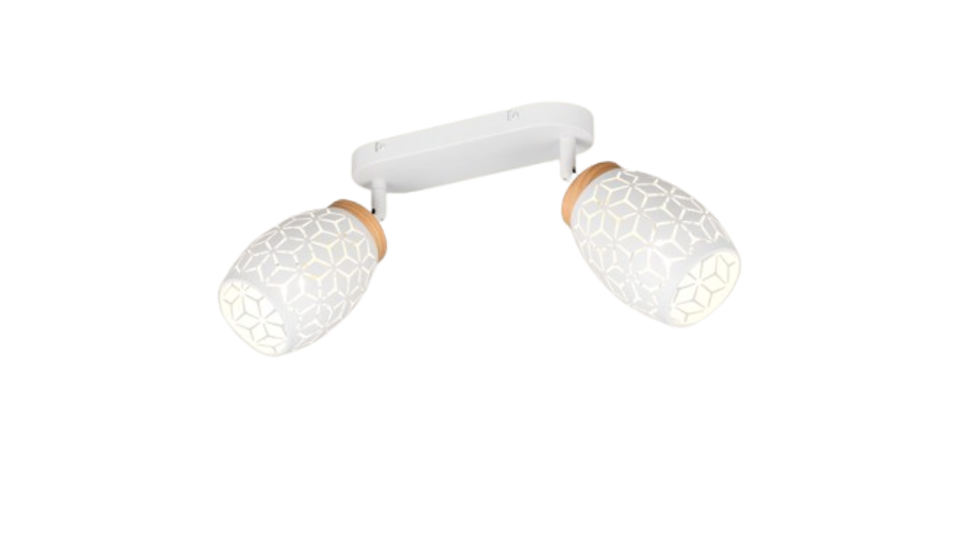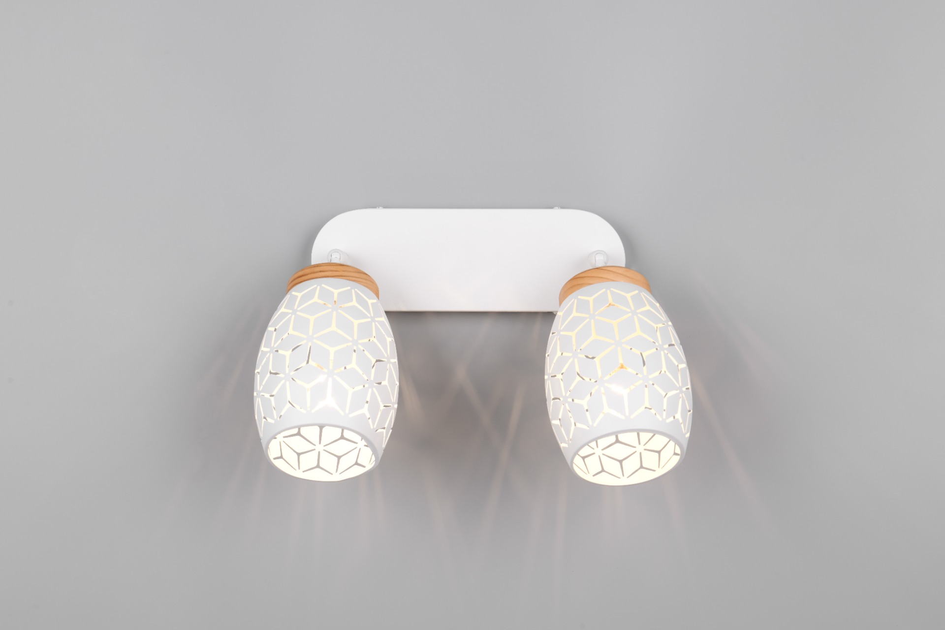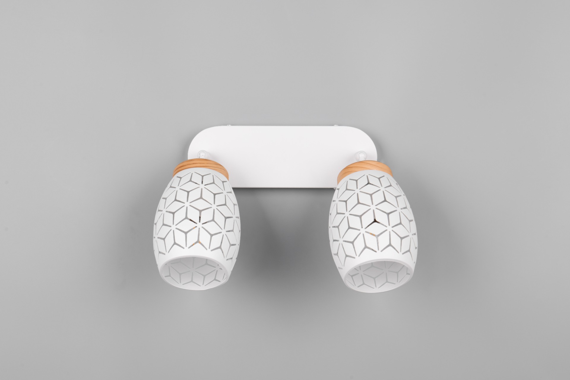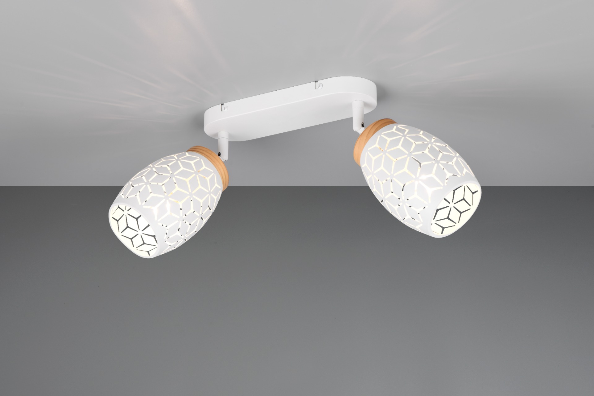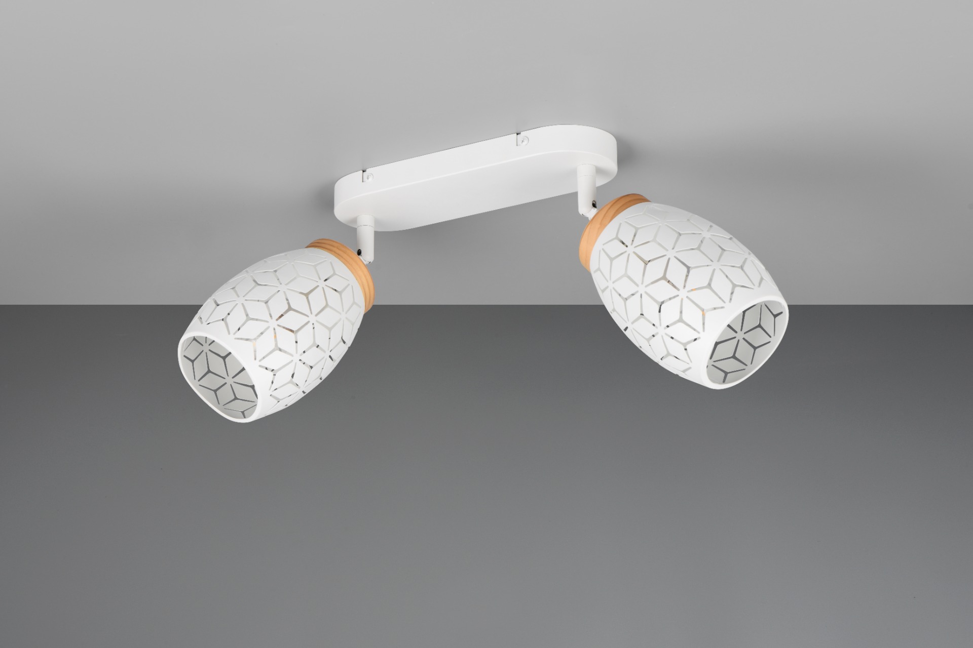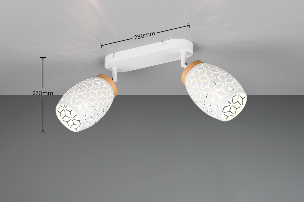De Bidar opbouwspot met twee lichtpunten zorgt voor een warme en gezellige sfeer in uw huis. Door de mooie patronen schijnt het licht op een zachte manier naar buiten. Dit geeft een bijzonder en speels lichteffect in de woon of slaapkamer. De lamp heeft natuurlijke houten accenten die zorgen voor een warm en knus gevoel. Het wit-matte metaal in combinatie met het hout en het moderne ontwerp maakt deze opbouwspot een echte blikvanger. De lichtbundel van deze beweegbare spot kan eenvoudig in de juiste richting worden gericht. De Bidar past goed in verschillende woonstijlen en geeft uw interieur een stijlvol accent. De lamp wordt geleverd exclusief 2x E14 lichtbronnen (max. 10W). Plaats de plafondlamp op een externe dimmer en u zet moeiteloos de juiste lichtsfeer neer. Leuk om te combineren met alle andere lampen uit de Bidar collectie.