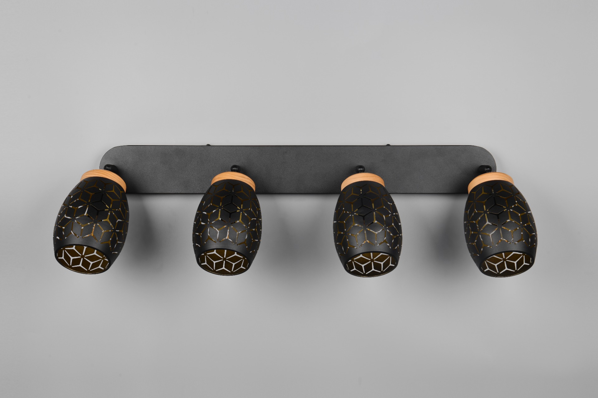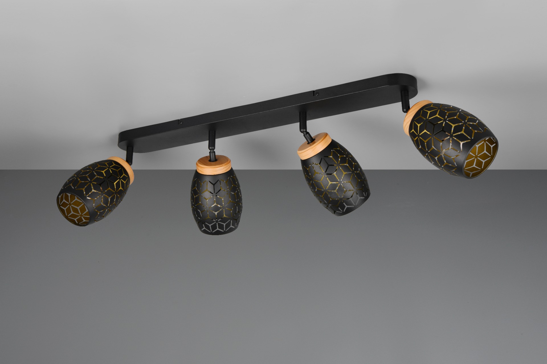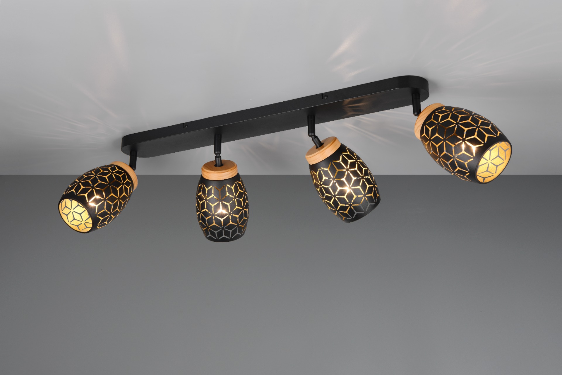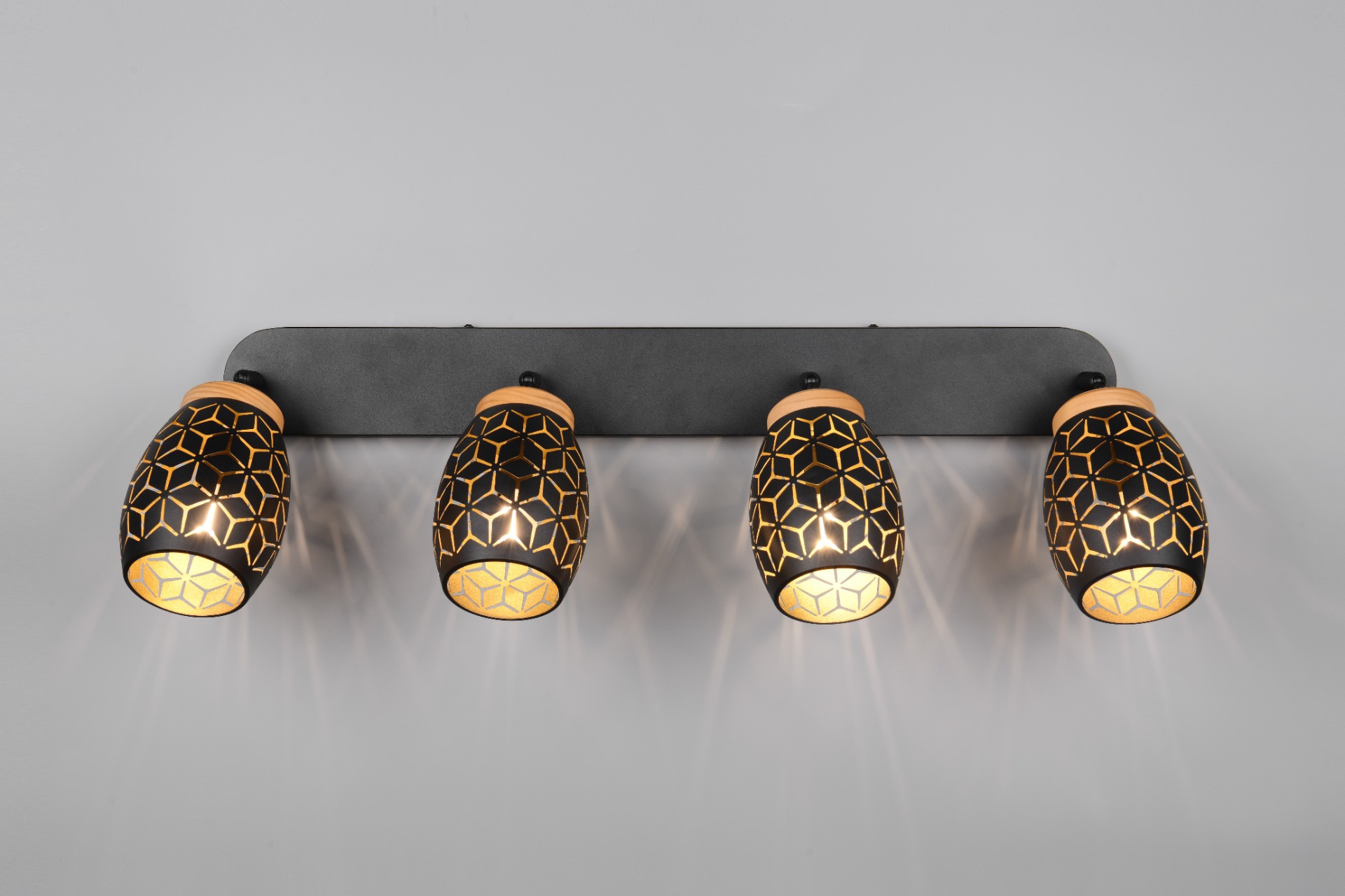 De Bidar opbouwspot met vier lichtpunten zorgt voor een warme en gezellige sfeer in uw huis. Door de mooie patronen schijnt het licht op een zachte manier naar buiten. Dit geeft een bijzonder en speels lichteffect in de woon of slaapkamer. De lamp heeft natuurlijke houten accenten die zorgen voor een warm en knus gevoel. Het zwart-goud gekleurd metaal in combinatie met het hout en het moderne ontwerp maakt deze opbouwspot een echte blikvanger. De lichtbundel van deze beweegbare spot kan eenvoudig in de juiste richting worden gericht. De Bidar past goed in verschillende woonstijlen en geeft uw interieur een stijlvol accent. De lamp wordt geleverd exclusief 4x E14 lichtbronnen (max. 10W). Plaats de plafondlamp op een externe dimmer en u zet moeiteloos de juiste lichtsfeer neer. Leuk om te combineren met alle andere lampen uit de Bidar collectie.