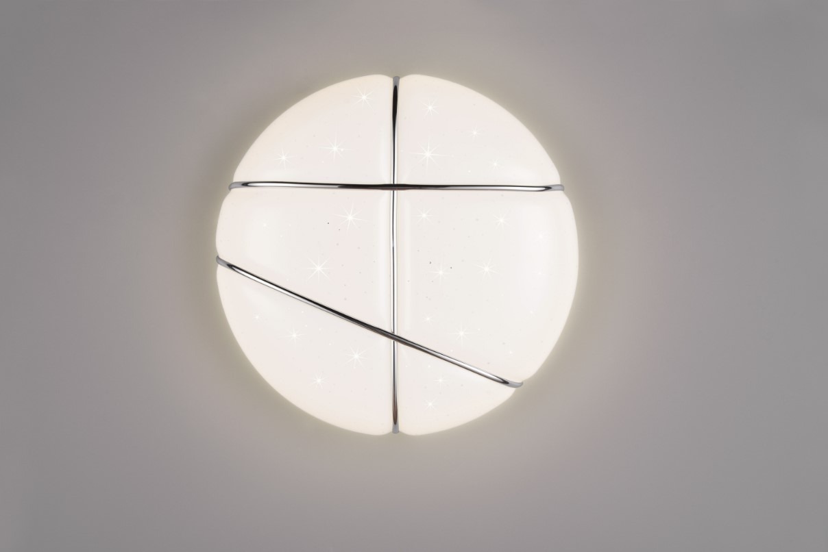 Plafondlamp Tibor heeft een elegant design. Deze plafonnière is gemaakt van kunststof maar heeft een zachte uitstraling. De chroomkleurige linten lijken zachtjes in de bol te snijden. De witte ondoorzichtige kap straalt aangenaam niet-verblindend licht uit en heeft een sterrenlicht-effect. Achter de kap bevindt zich een geïntegreerde LED lamp (10W). De lichtkleur van de lichtbron is 4000 Kelvin, het effect hiervan wordt omschreven als neutraal wit. Met de conventionele lichtschakelaar kan uit 3 helderheidsniveaus gekozen worden (25, 50 of 100%). Let wel, deze plafondlamp dient op een normale lichtschakelaar geplaatst te worden en is niet geschikt voor bediening door een externe dimmer.