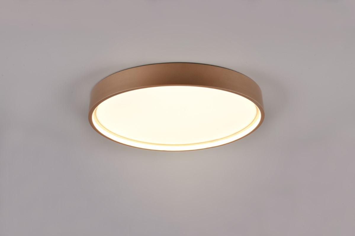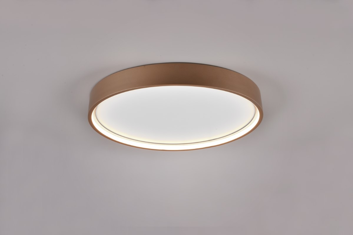 Een coffee-kleurige plafondlamp van het Duitse verlichtingsmerk Trio. De plafonnière is voorzien van twee krachtige geïntegreerde LED-lampen van 29 watt met een lichtopbrengst van 3260 lumen. De verschillende lichtbronnen kunnen met de normale lichtschakelaar apart aan- en uitgeschakeld worden. Door middel van de DIP SWITCH-schakelaar op de armatuur kunnen er drie lichtkleuren (van warm wit tot neutraal wit) op de lamp ingesteld worden (2300K - 3000K - 4000K). De Doha is niet geschikt voor een externe dimmer.
