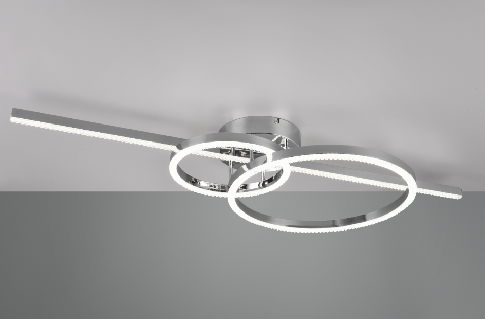 Een plafondlamp van het Duitse verlichtingsmerk Trio. De lamp is gemaakt van metaal en heeft een mooie chromen kleur. De lamp straalt eenvoud en elegantie uit. De ingebouwde LED lamp heeft een wattage van 54W. De lamp wordt geleverd met een afstandsbediening en heeft vele functies. Zo kan er bijvoorbeeld gekozen worden voor traploos dimmen, de lichtkleur aanpassen van warm naar koelwit licht (2700K-6000K), geheugenfunctie en nachtlampfunctie.